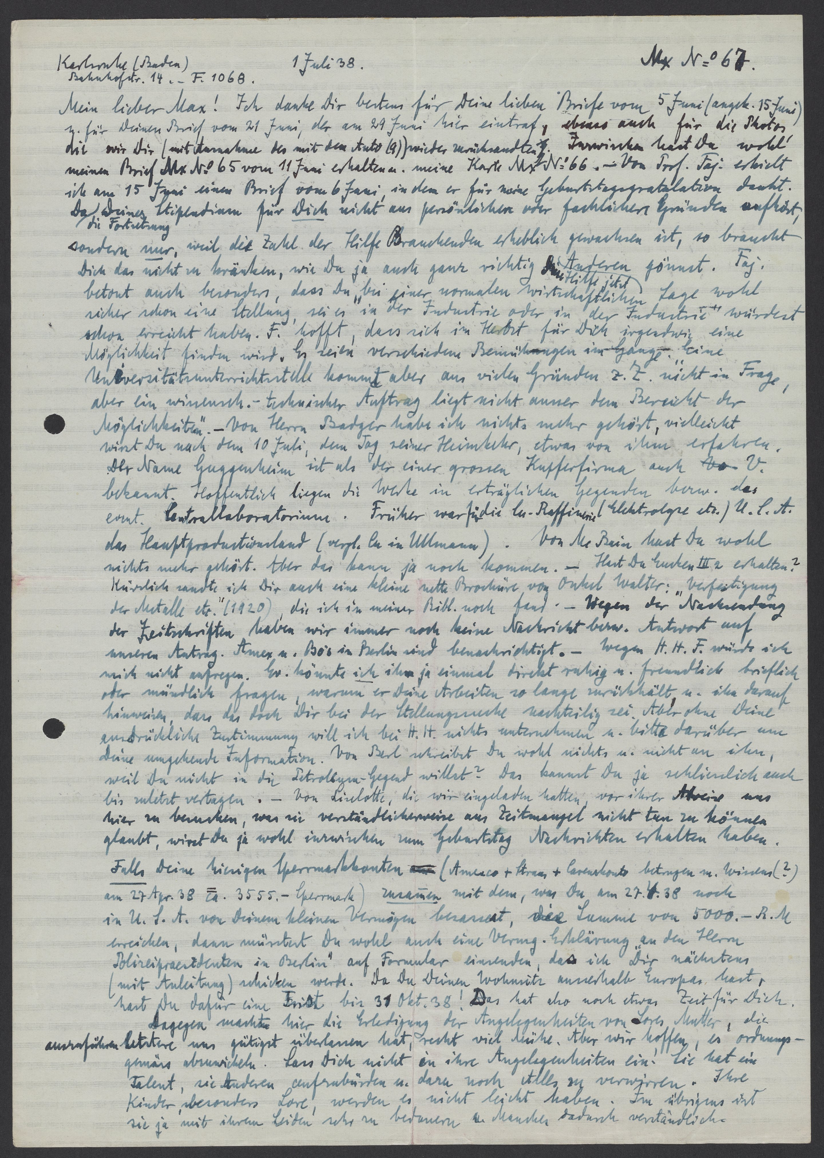 Mein lieber Max! Ich danke Dir bestens für Deine lieben Briefe vom 5 Juni (angek. 15 Juni) u. für Deinen Brief vom 21 Juni, der am 29 Juni hier eintraf, ebenso auch für die Photos die wir Dir (mit Aufnahme des mit dem Auto (9)) wieder zurücksandten. Inzwischen hast Du wohl meinen Brief Mx No 65 vom 11 Juni erhalten u. meine Karte Mx No 66. Von Prof. Faj. erhielt ich am 15 Juni einen Brief vom 6 Juni, in dem er für meine Geburtstagsgratulation dankt. Da die Fortsetzung Deines Stipendiums für Dich nicht aus persönlichen oder fachlichen Gründen auflöst, sondern nur weil die Zahl der Hilfe Brauchenden erheblich gewachsen ist, so braucht Dich das nicht zu kränken, wie Du ja auch ganz richtig Hilfe jetzt Anderen gönnt. Faj. betont auch besonders, dass Du „bei einer normalen wirtschaftlichen Lage wohl sicher schon eine Stellung, sei es in der Industrie oder in der Industrie“ würdest schon erreicht haben. F. hofft, dass sich im Herbst für Dich irgendwie eine Möglichkeit finden wird. Es seien verschiedene Bemühungen im Gange. „Eine Universitätsunterrichtsstelle kommt aber aus vielen Gründen z.Z. nicht in Frage, aber ein wissensch. – technischer Auftrag liegt nicht ausser dem Bereich der Möglichkeiten.“ – Von Herrn Badger habe ich nichts mehr gehört, vielleicht wirst Du nach dem 10 Juli, dem Tag seiner Heimkehr etwas von ihm erfahren. Der Name Guggenheim ist als der einer grossen Kupferfirma auch V. bekannt. Hoffentlich liegen die Werke in erträglichen Gegenden bezw. das event. Centrallaboratorium. Früher war für die Cu – Raffinerie (Elektrolyse etc.) U.S.A das Hauptproductionsland (vergl. Cu. in Ullmann) Von McBain hast Du wohl nichts mehr gehört. Aber das kann ja noch kommen. – Hast Du Eucken III 2 erhalten? Kürzlich sandte ich Dir auch eine kleine nette Broschüre von Onkel Walter: „Verfertigung der Metalle etc.“ (1920), die ich in meiner Bibl. noch fand.- Wegen der Nachsendung der Zeitschriften haben wir immer noch keine Nachricht bezw. Antwort auf unseren Antrag. Amex u. Bo.‘s in Berlin sind benachrichtigt. – Wegen H.H.F. würde ich mich nicht aufregen. Ev. könnte ich ihn ja einmal direkt ruhig u. freundlich brieflich oder mündlich fragen, warum er Dich Arbeiten so lange zurückhält, u. ihn darauf hinweisen, dass das doch Dir bei der Stellungssuche nachteilig sei. Aber ohne Deine ausdrückliche Zustimmung will ich bei H.H. nichts unternehmen u. bitte darüber um deine umgehende Information. Von Berl schreibst Du wohl nichts u. nicht an ihn, weil Du nicht in die Petrolia-Gegend willst? Das kannst Du ja schliesslich auch bis zuletzt vertagen. – Von Liselotte, die wir eingeladen hatten, vor ihrer Abreise uns hier zu besuchen, was sie verständlicherweise aus Zeitmangel nicht tun zu können glaubt, wirst Du ja wohl inzwischen zum Geburtstag Nachrichten erhalten haben. Falls Deine hiesigen Sperrmarkkonten (Amexco + Straus + Carenzkonto Betrage u. wissen (?) am 27 Apr. 38 ca. 3555.- Sperrmark) zusammen mit dem was Du am 27. 4. 38 noch in U.S.A. von Deinem kleinen Vermögen besassest, die Summe von 5000. – R.M. erreichen, dann müsstest Du wohl auch eine Vermg. Erklärung an den Herrn Polizeipräsidenten in Berlin auf Formular einsenden, das ich Dir nächstens (mit Anleitung) schicken werde. Da Du Deinen Wohnsitz ausserhalb Europas hast, hast Du dafür eine Frist bis 31 Okt. 38! Das hast Du also noch etwas Zeit für Dich.