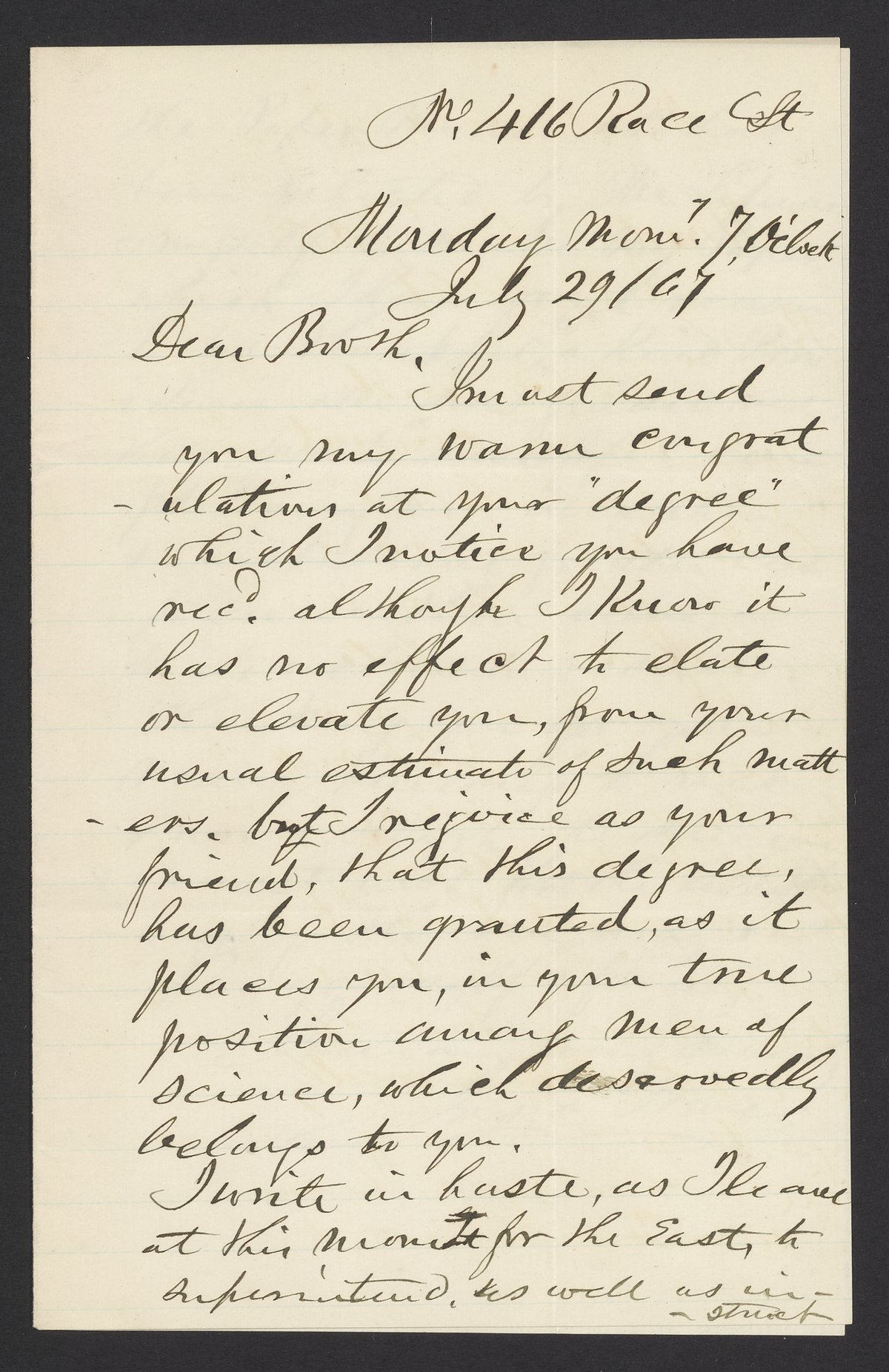 Small JPG1200 x 1852px — 327 KBFull-sized JPG2010 x 3102px — 765 KBOriginal fileTIFF — 2010 x 3102px — 17.9 MBJoseph E. Hoven writes to James Curtis Booth (1810-1888) to congratulate Booth on his completion of a Legum Doctoral (LL.D.) degree