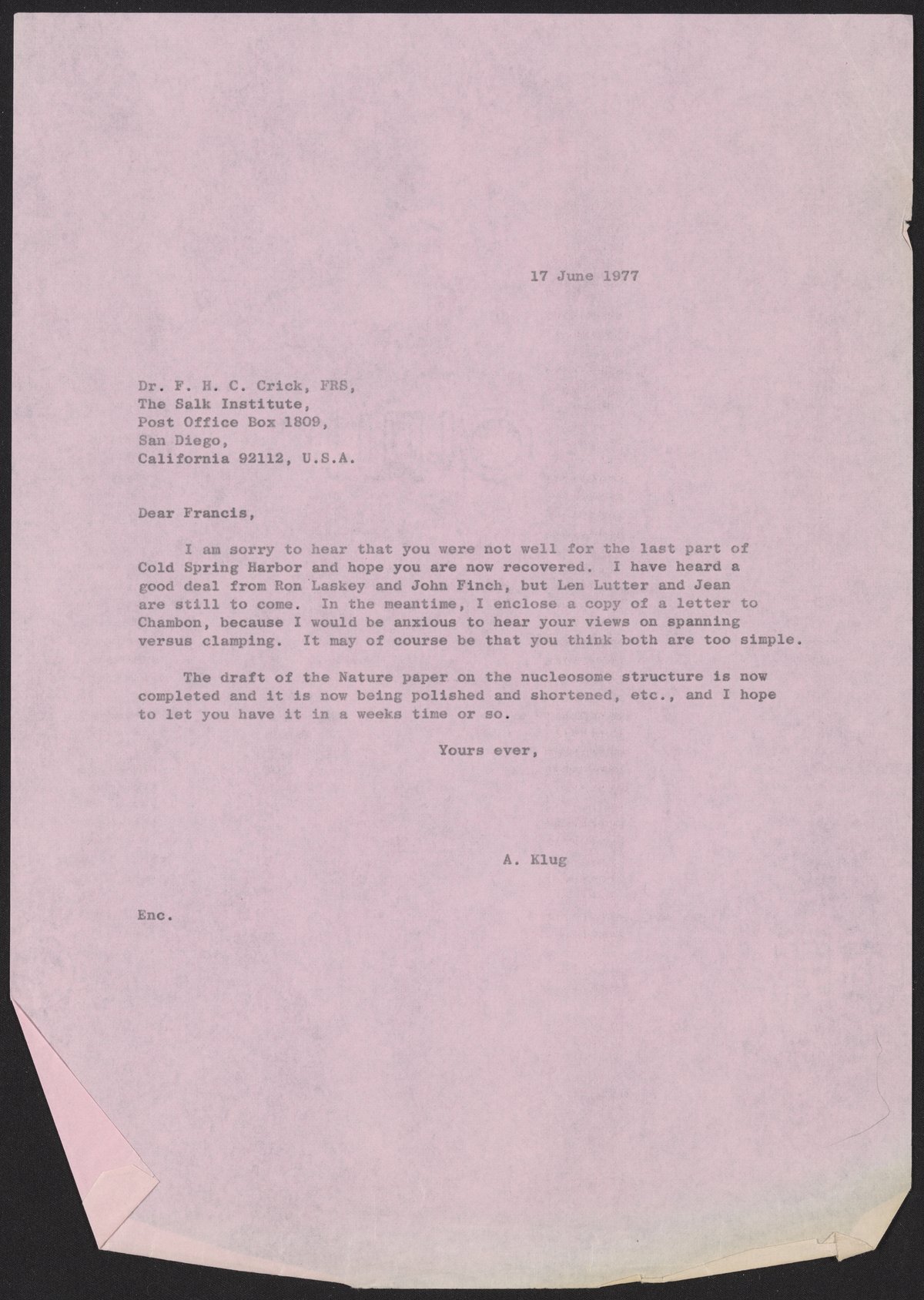 Klug, A. (Aaron), Sir. “Letter from Aaron Klug to Francis Crick, June 17, 1977,” June 17, 1977. History of Molecular Biology Collection, Box 20, Folder 1. Science History Institute. Philadelphia. https://digital.sciencehistory.org/works/idyr4i1.