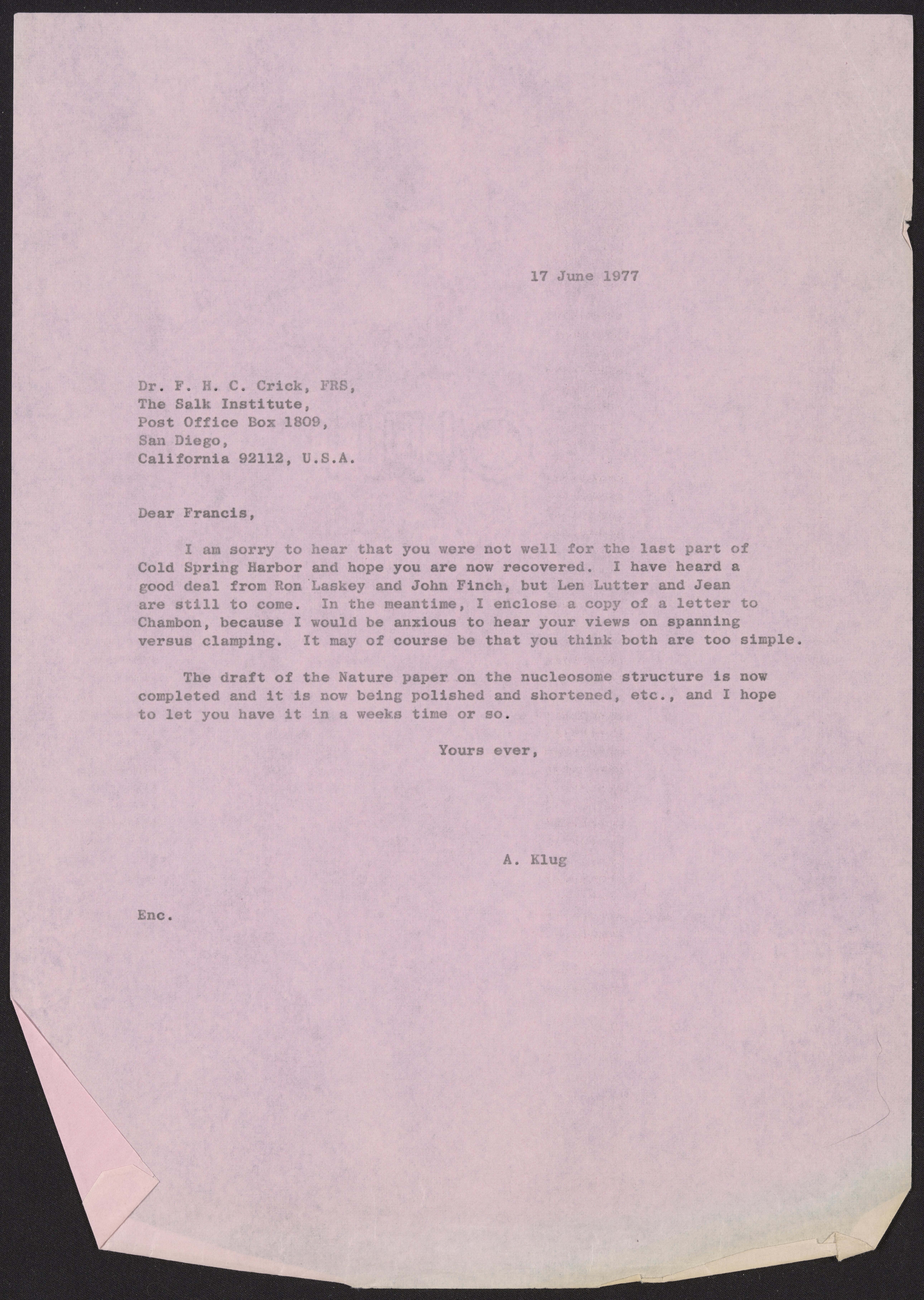 Letter from Aaron Klug to Francis Crick, June 17, 1977