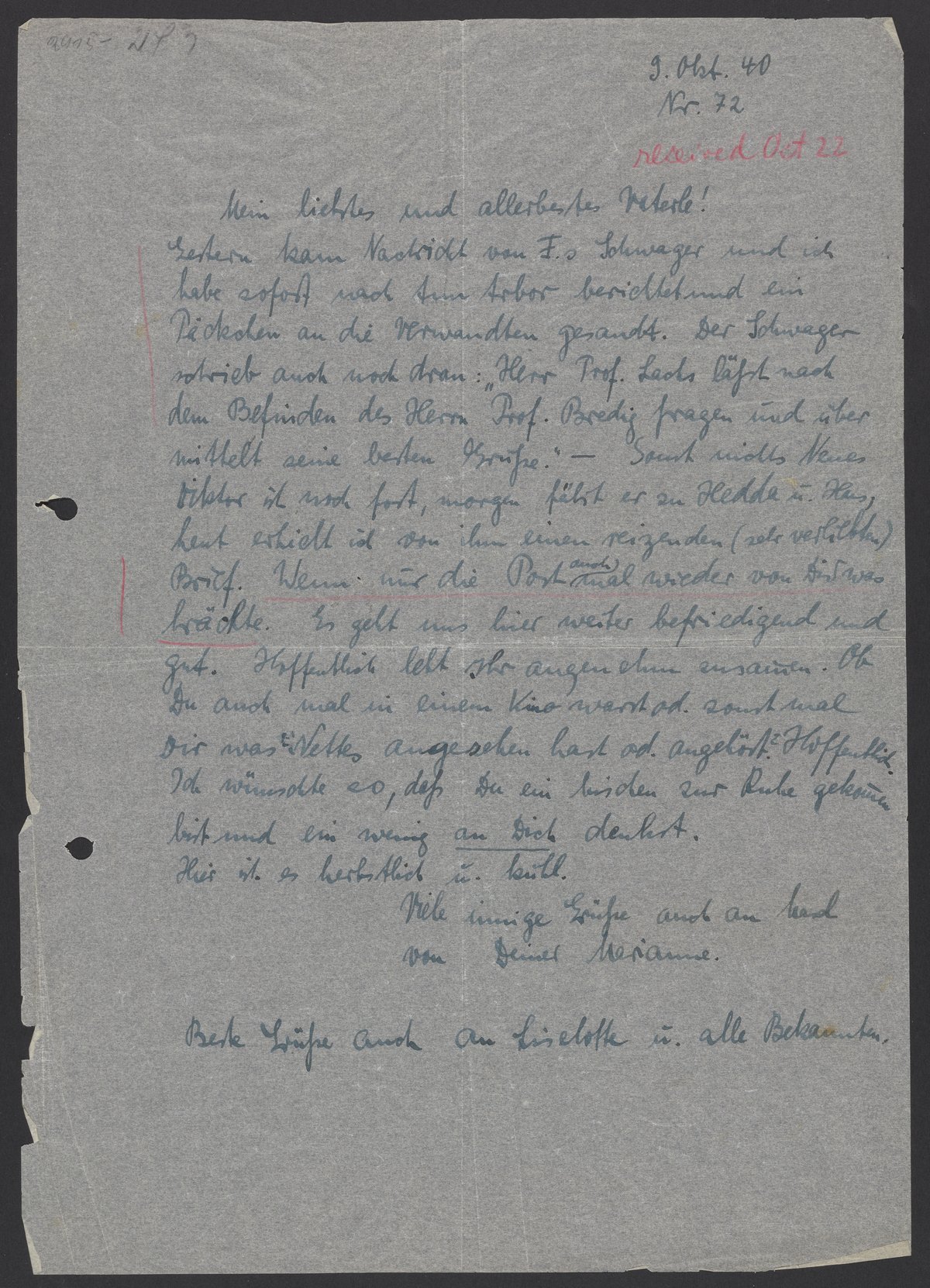 Gestern kam Nachricht von F.s Schwager und ich habe sofort nach Ann Arbor berichtet und ein Päckchen an die Verwandten gesandt. Der Schwager schrieb auch noch dran: „Herr Prof. Lachs läßt nach dem Befinden des Herrn Prof. Bredig fragen und übermittelt seine besten Grüße.“ – Sonst nichts Neues. Viktor ist noch fort, morgen fährt er zu Hedda u. Hans, heut erhielt ich von ihm einen reizenden (sehr verliebten) Brief. Es geht uns hier weiter befriedigend und gut. Hoffentlich lebt Ihr angenehm zusammen. Ob Du auch mal in einem Kino warst od. Sonst mal Dir was Nettes angesehen hast od. angehört? Hoffentlich. Ich wünsche es, dass Du ein bischen zur Ruhe gekommen bist und ein wenig an Dich denkst! Hier ist es herbstlich u. kühl.