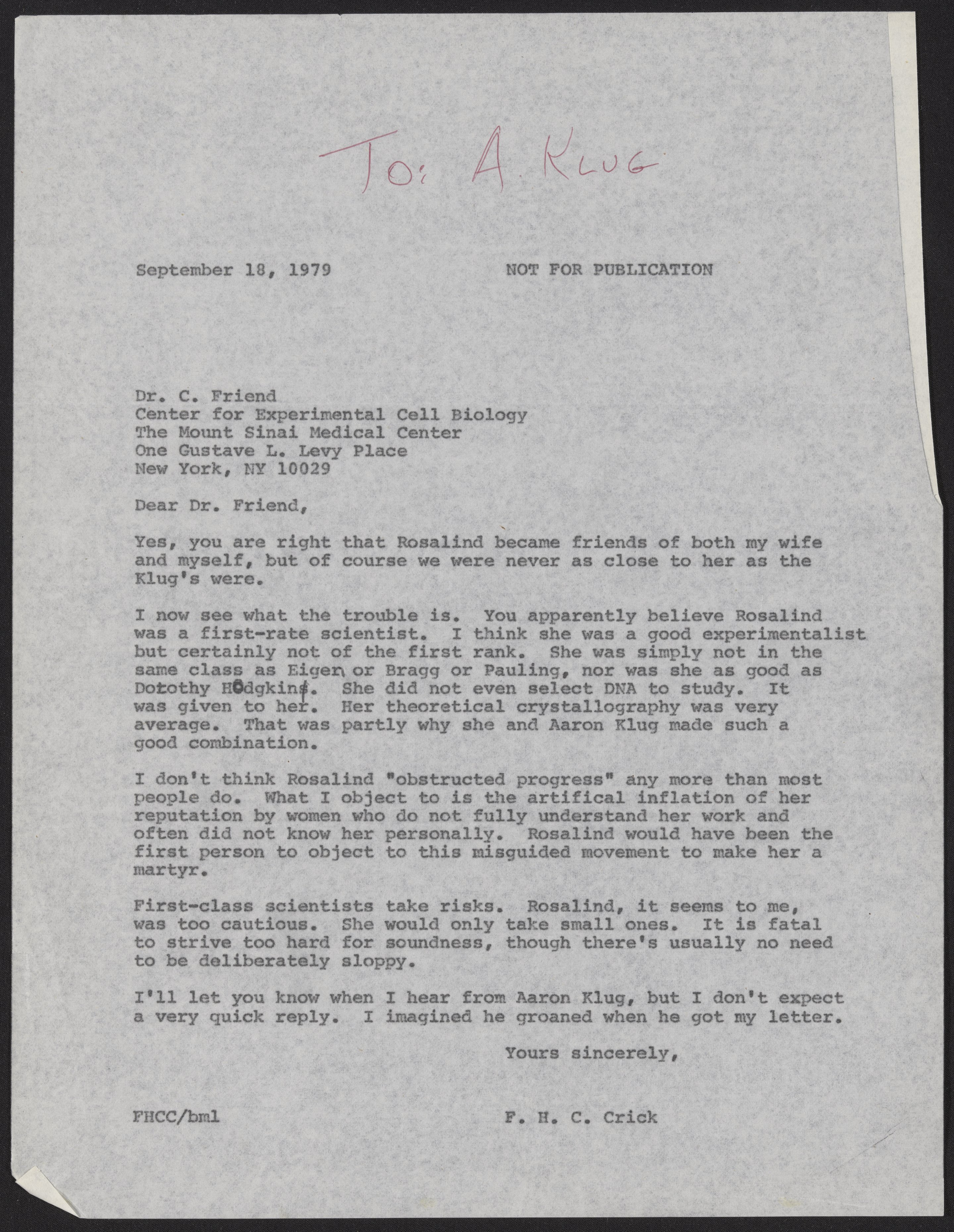 Crick, Francis. “Letter from Francis Crick to Charlotte Friend, September 18, 1979,” September 18, 1979. History of Molecular Biology Collection, Box 20, Folder 3. Science History Institute. Philadelphia. https://digital.sciencehistory.org/works/iiyvc52.