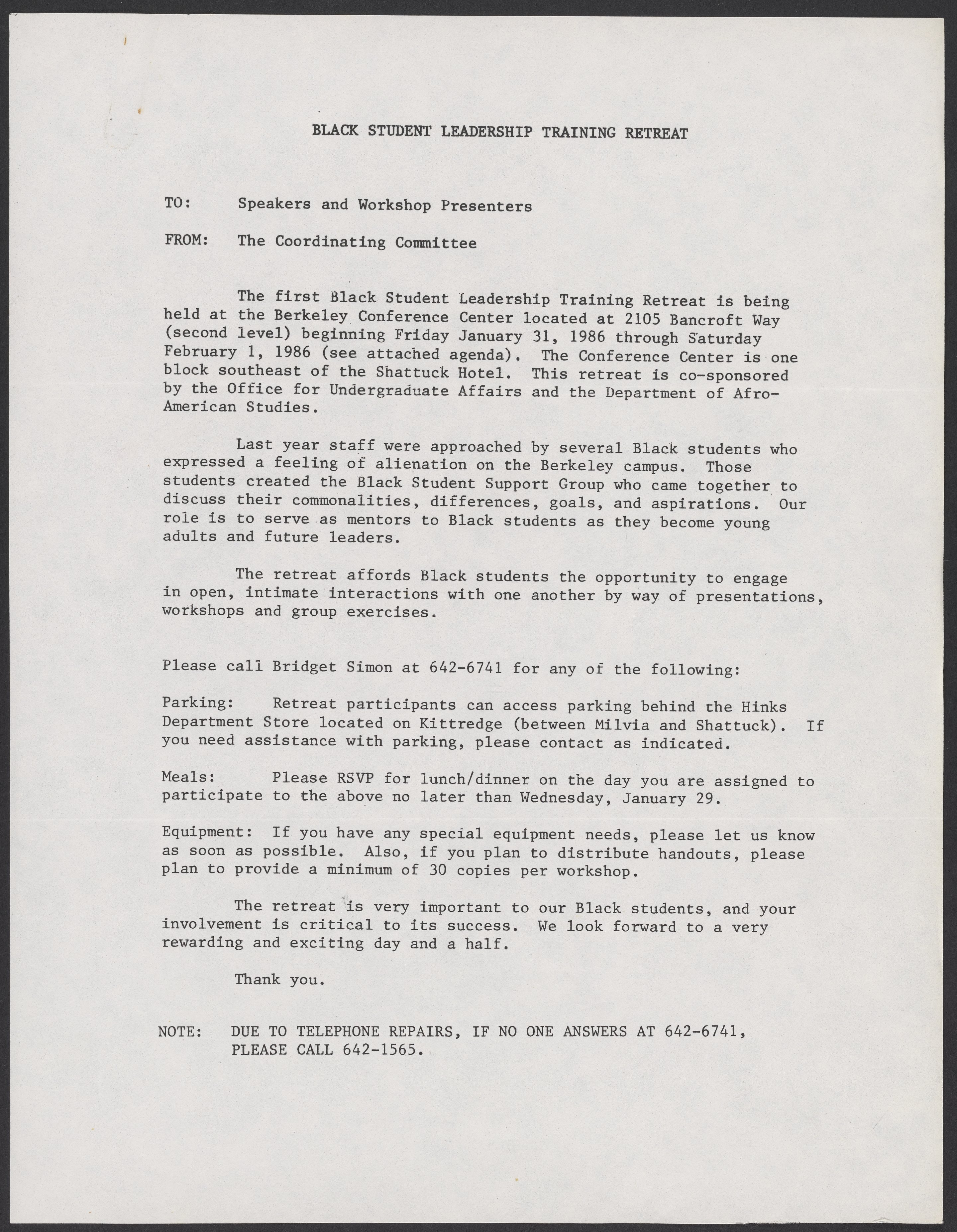 Letter or memo to speakers and workshop presenters participating in an upcoming Black Student Leadership Training Retreat, organized by the University of California, Berkeley's Black Student Support Group and cosponsored by the university's Office for Undergraduate Affairs and the Department of Afro-American Studies. The letter outlines the reason for the retreat, and logistics and accommodations for participants.