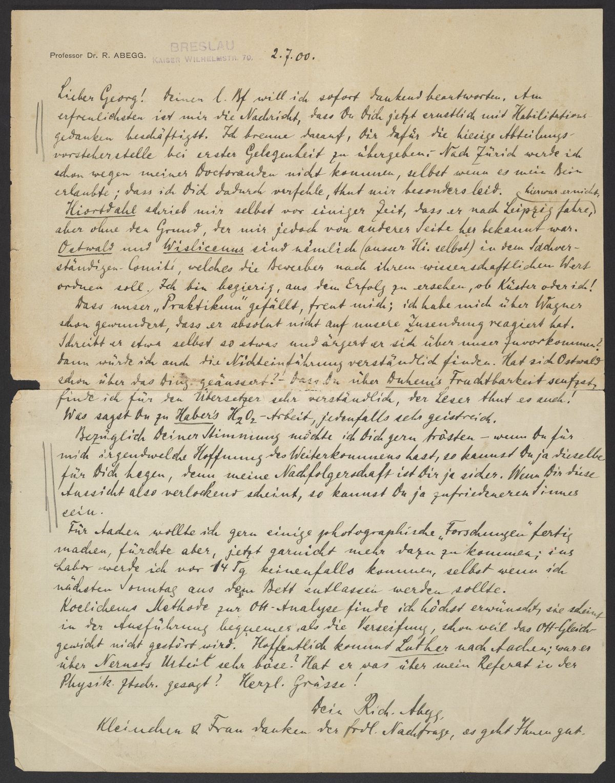 Letter from Richard Abegg to Georg Bredig