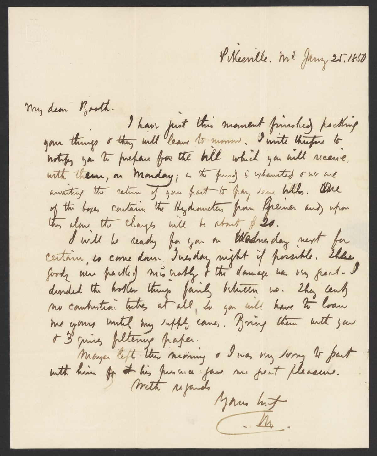 Morfit, Campbell. “Letter from Campbell Morfit to James Curtis Booth, January 25, 1850,” January 25, 1850. Papers of James Curtis Booth, Box 1, Folder 10. Science History Institute. Philadelphia. https://digital.sciencehistory.org/works/ilvgqt6.
