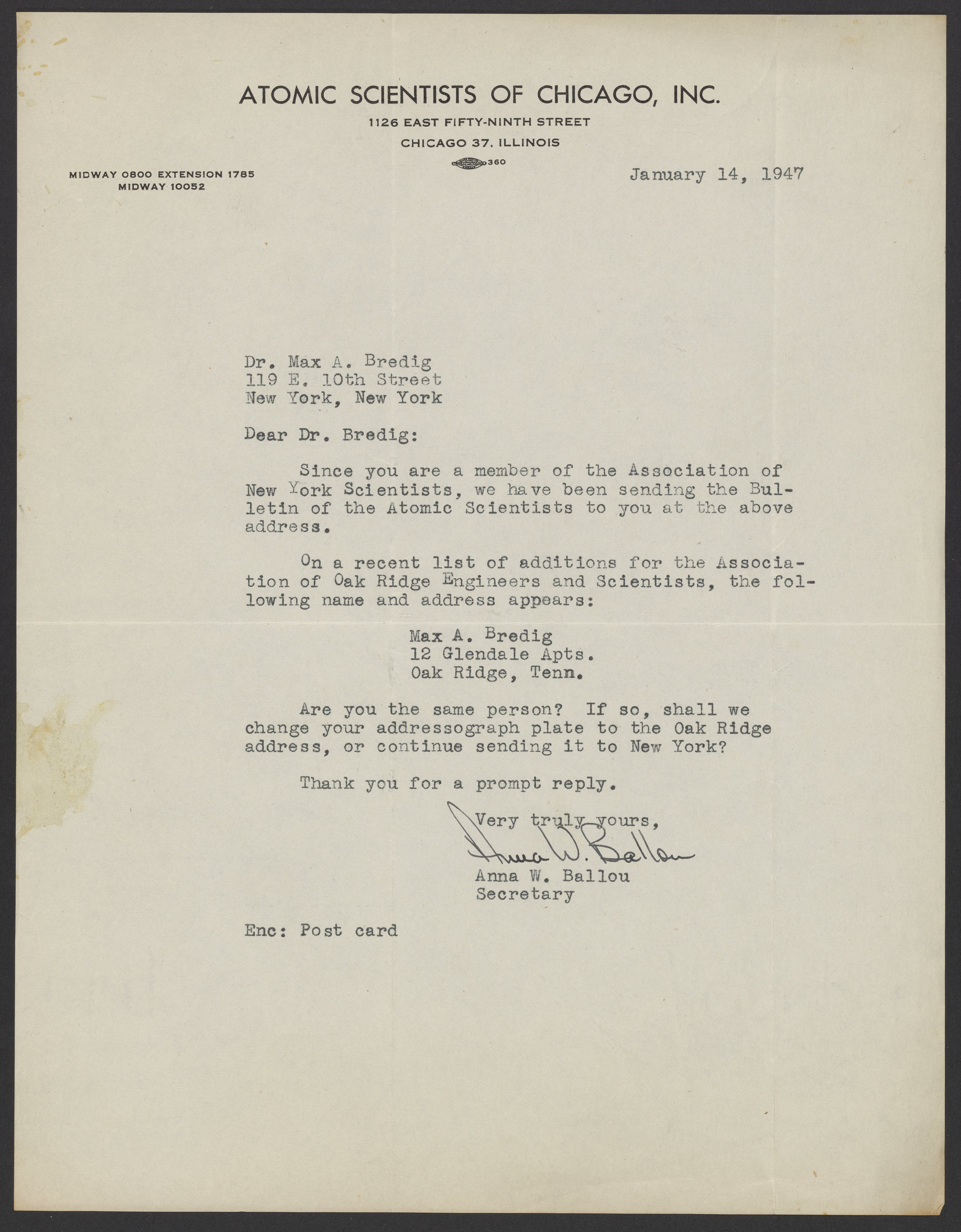 Letter to Max Bredig from Anna W. Ballou on behalf of the Atomic Scientists of Chicago, Inc.