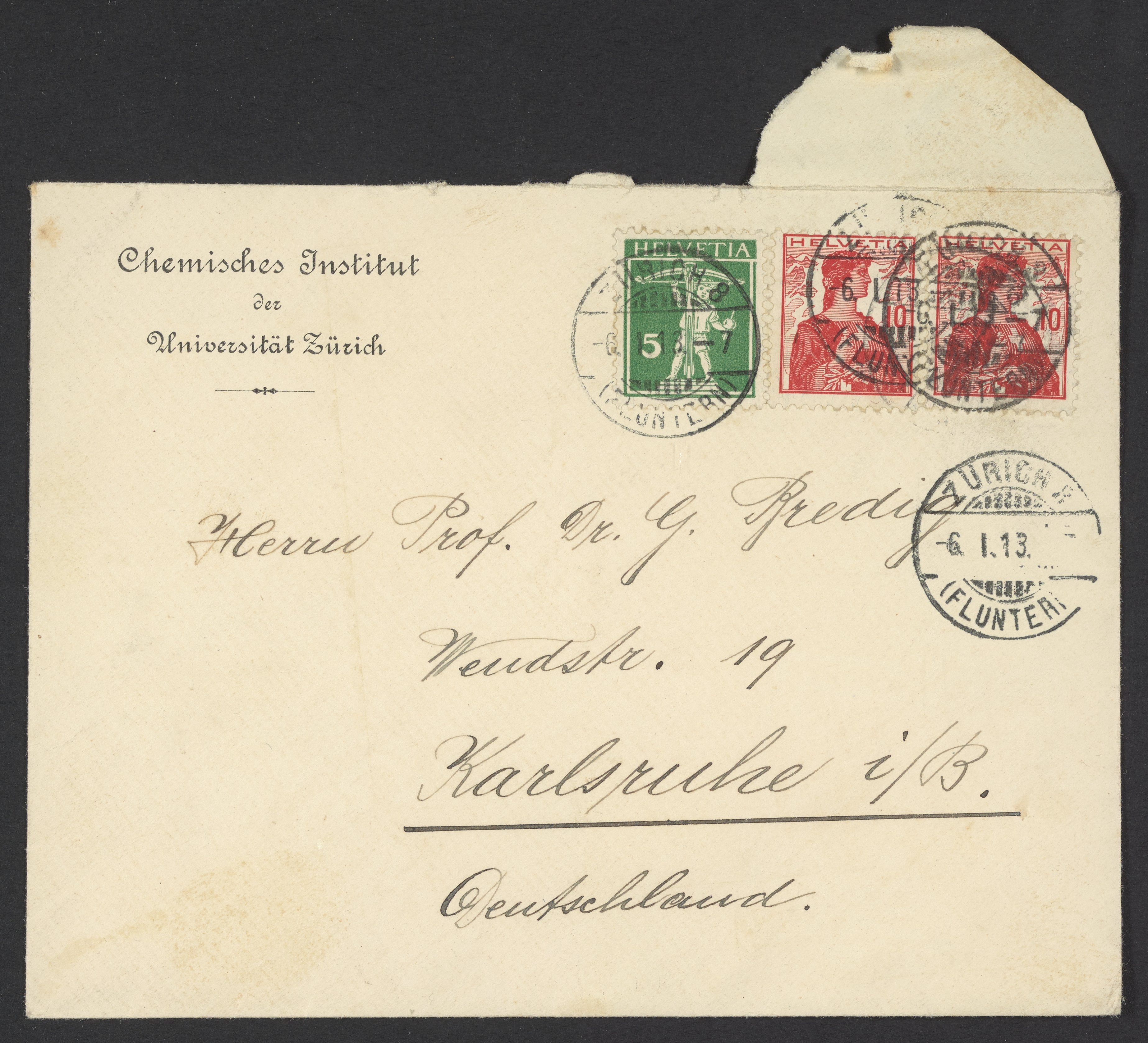 Envelope addressed to Georg Bredig from the Chemisches Institut der Universität Zurich