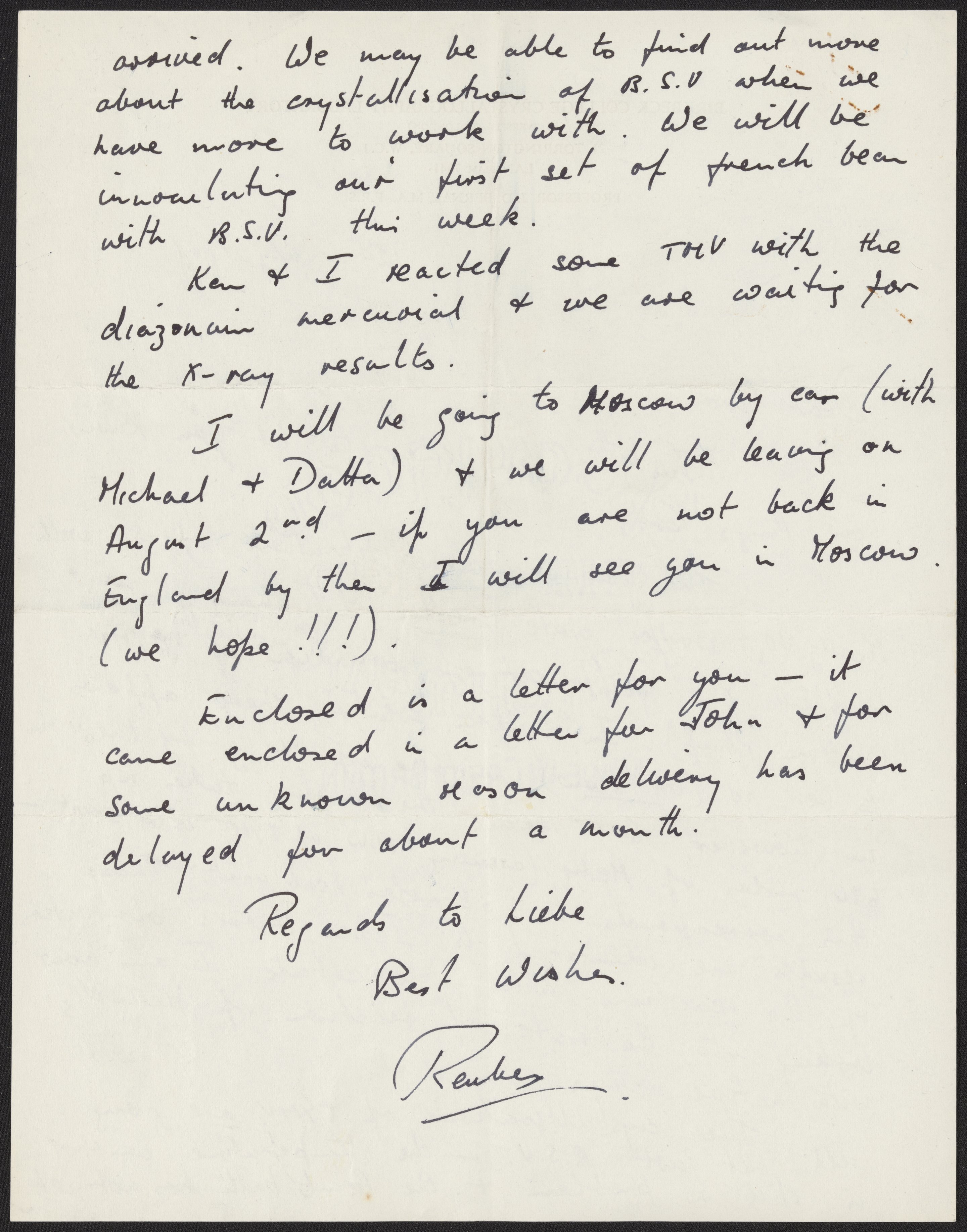 “Letter to Aaron Klug, July 12, 1961,” July 12, 1961. History of Molecular Biology Collection, Box 17, Folder 12. Science History Institute. Philadelphia. https://digital.sciencehistory.org/works/is8mev8.