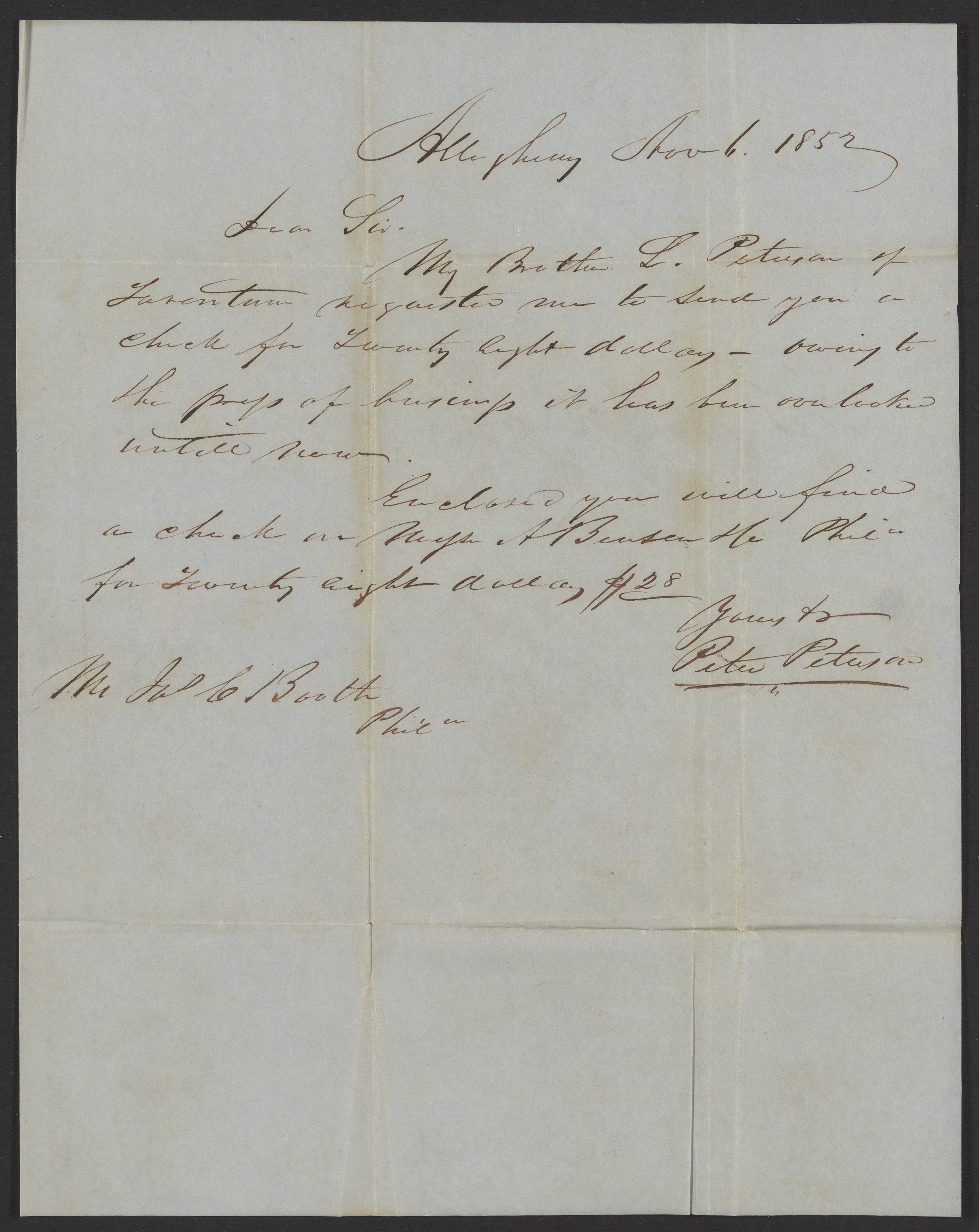 Small JPG1200 x 1511px — 217 KBLarge JPG2880 x 3626px — 1.2 MBFull-sized JPG3311 x 4169px — 1.6 MBOriginal fileTIFF — 3311 x 4169px — 39.6 MBPeter Peterson, brother of Lewis Peterson, encloses a check for James Curtis Booth (1810-1888) to pay for the water-sample analysis Booth completed.