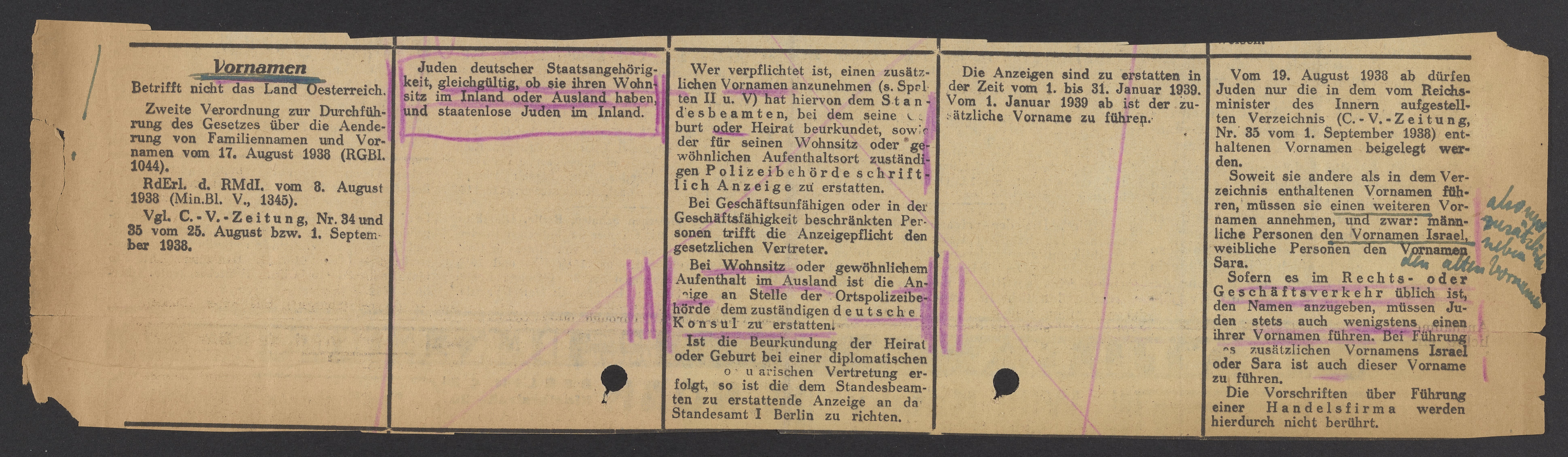Small JPG1200 x 350px — 105 KBLarge JPG2880 x 840px — 543 KBFull-sized JPG7752 x 2261px — 3.6 MBOriginal fileTIFF — 7752 x 2261px — 50.2 MBNewspaper article from C.V.-Zeitung (Central-Verein-Zeitung), a Jewish newspaper published in Berlin from 1922-1938, with a table of regulations for identification cards, first names, and passports for German-Jewish people. The chart lists the laws, who it affects, the authority, deadlines, and any special provisions.