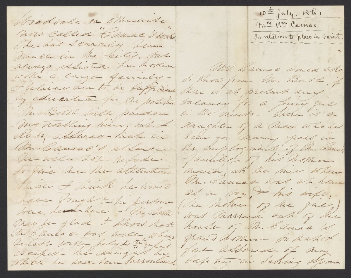 Small JPG1200 x 952px — 205 KBLarge JPG2880 x 2284px — 897 KBFull-sized JPG4350 x 3450px — 1.7 MBOriginal fileTIFF — 4350 x 3450px — 43.0 MBMrs. William Camac inquires of James Curtis Booth (1810-1888) if there is "at present any vacancy for a... girl in the Mint."