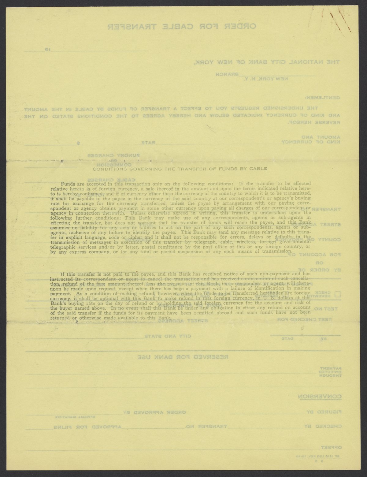 National City Bank of New York. “Order for Cable Transfer Form,” circa 1940. Papers of Georg and Max Bredig, Box 9, Folder 10. Science History Institute. Philadelphia. https://digital.sciencehistory.org/works/iwpgpyr.