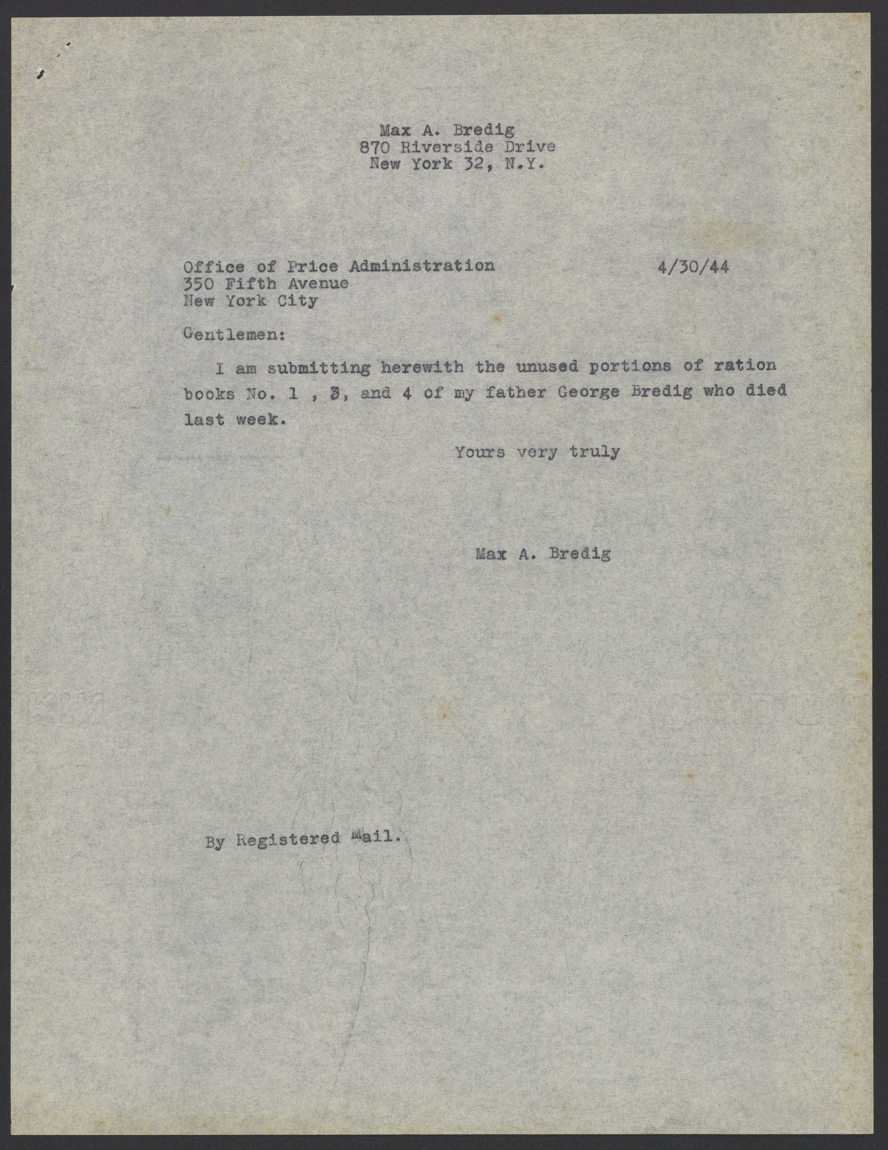 Small JPG1200 x 1553px — 345 KBLarge JPG2880 x 3727px — 2.3 MBFull-sized JPG5318 x 6882px — 7.5 MBOriginal fileTIFF — 5318 x 6882px — 105 MBMax Bredig (1902-1977) sends ration books belonging to his late father, Georg Bredig (1868-1944) to the Office of Price Administration.