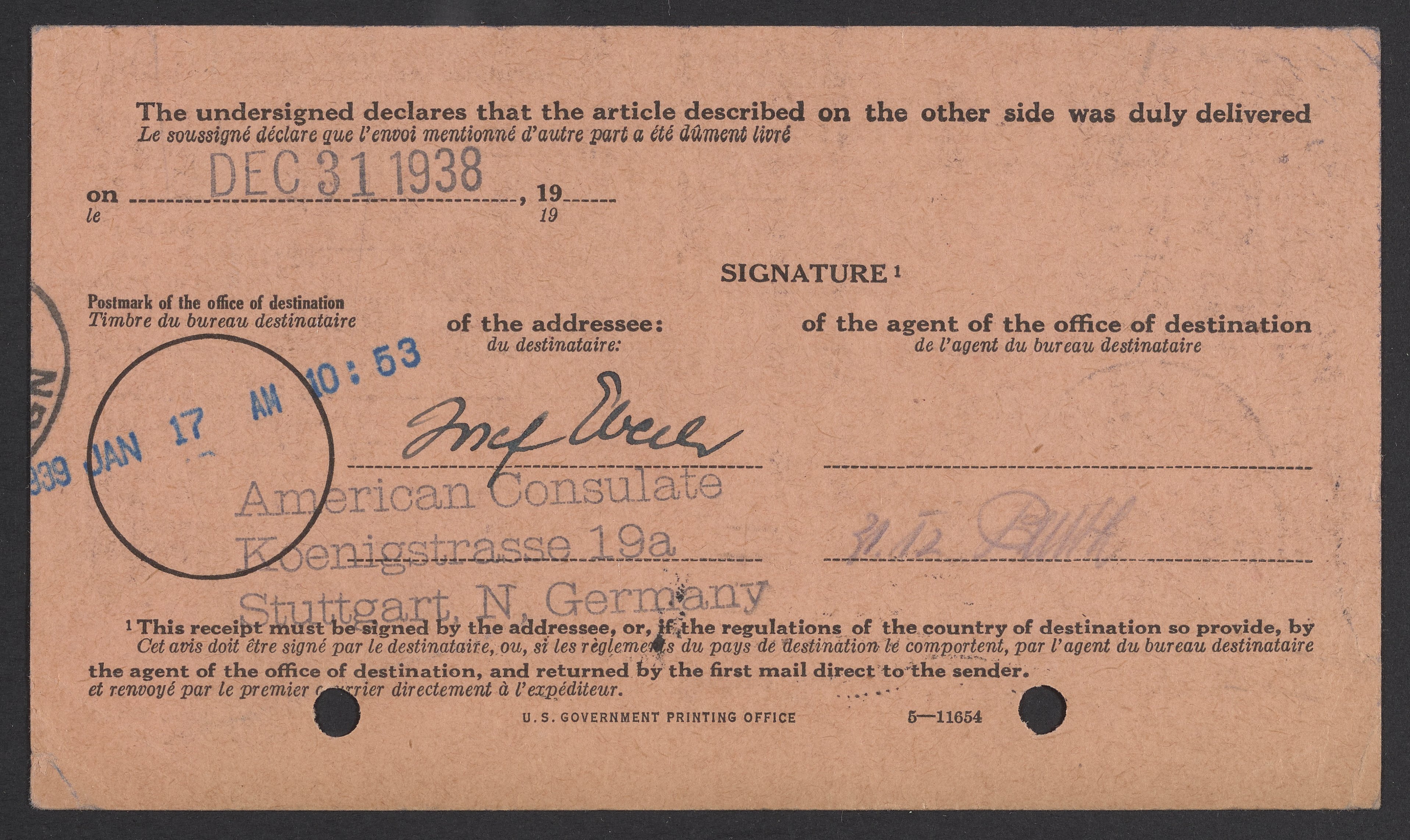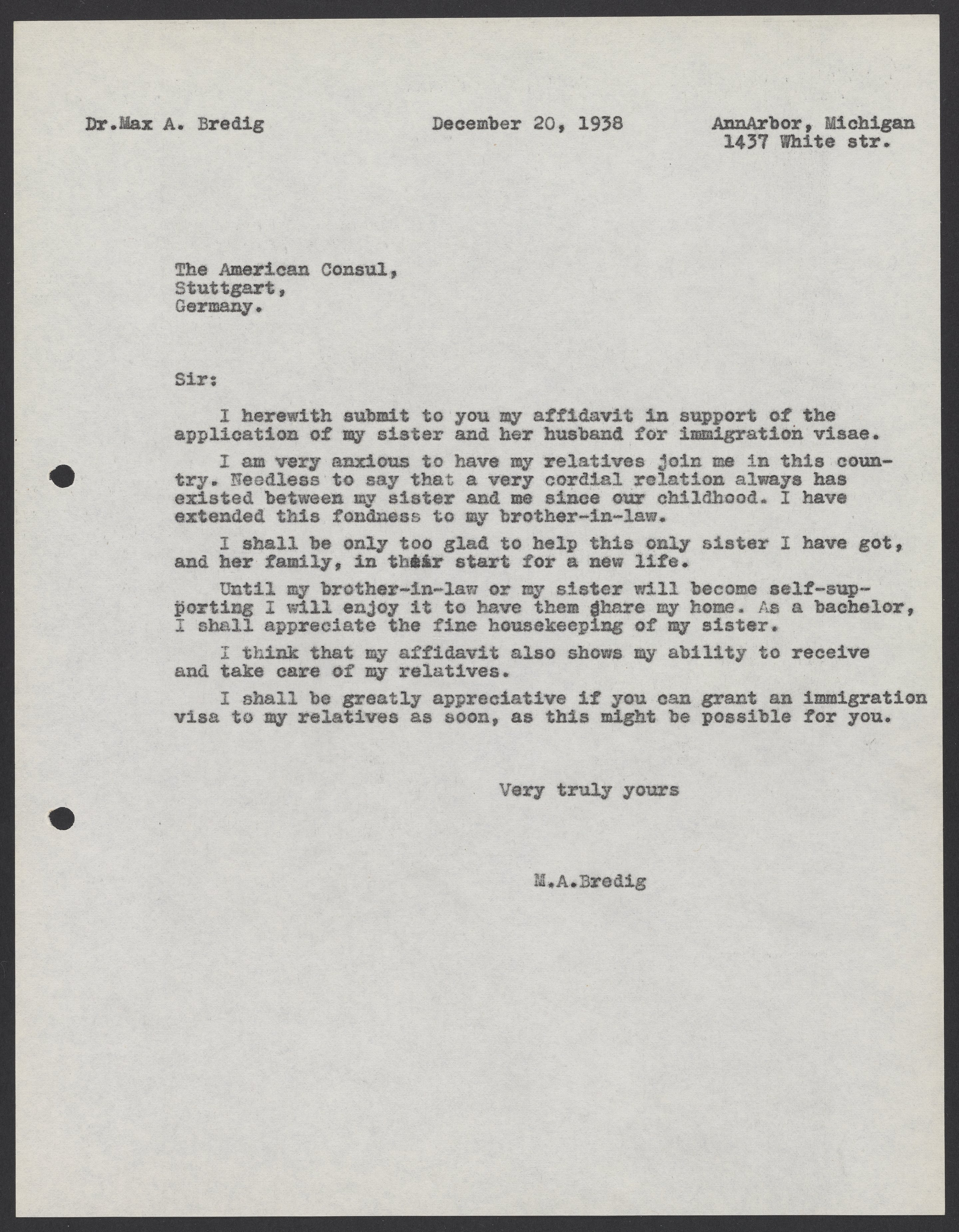 Letter from Max Bredig to the American consul, Stuttgart, December 20, 1938