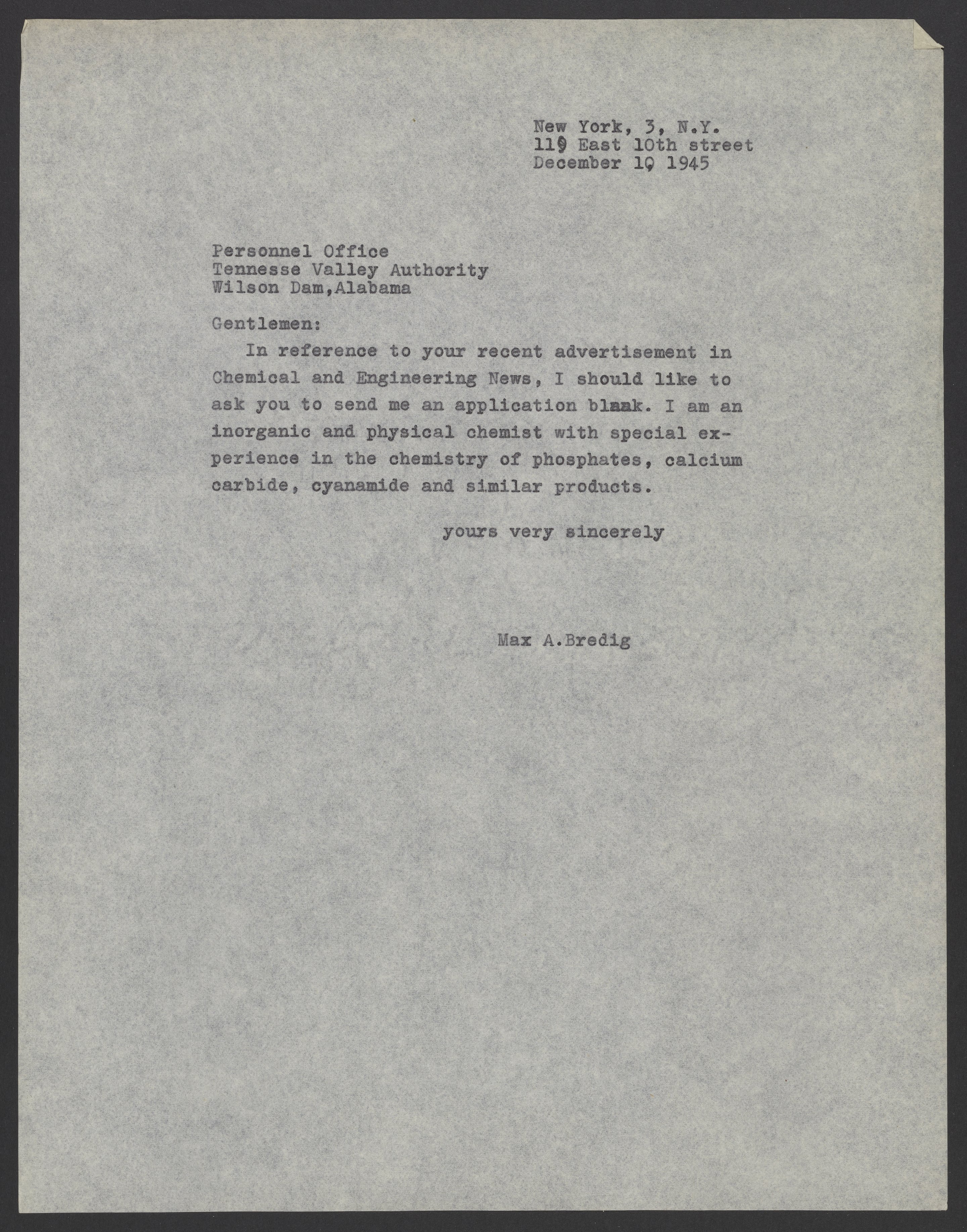Bredig, Max Albert. “Letter from Max Bredig to the Tennessee Valley Authority Personnel Office,” December 10, 1945. Papers of Georg and Max Bredig, Box 10, Folder 34. Science History Institute. Philadelphia. https://digital.sciencehistory.org/works/izz45fq.