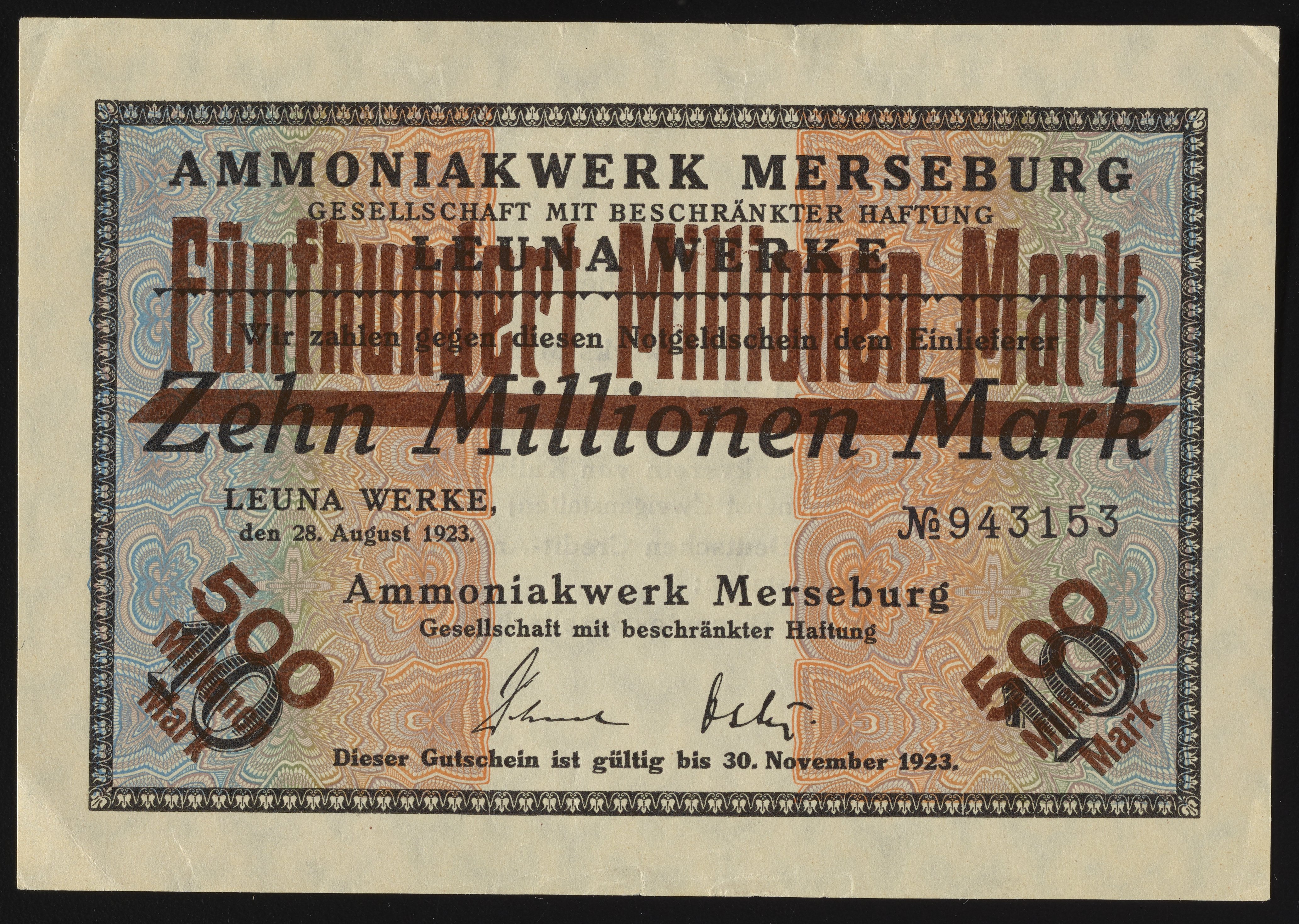 Small JPG1200 x 854px — 286 KBLarge JPG2880 x 2050px — 1.5 MBFull-sized JPG4129 x 2939px — 2.8 MBOriginal fileTIFF — 4129 x 2939px — 34.8 MBThis Zehn Millionen/Fünfhundert Millionen Mark Notgeldschein, or ten million/five hundred million Mark emergency money bill, was issued by Ammoniakwerk Merseburg of Badische Anilin- & Soda-Fabrik. Fünfhundert Millionen was printed over the original Zehn Millionen Mark voucher due to rampant hyperinflation. The verso of the company scrip includes the terms of the scrip. This particular voucher was issued by the Ammoniakwerk Merseburg Leuna-werk, or the ammonia works of Merseburg. Paper features a watermark design.