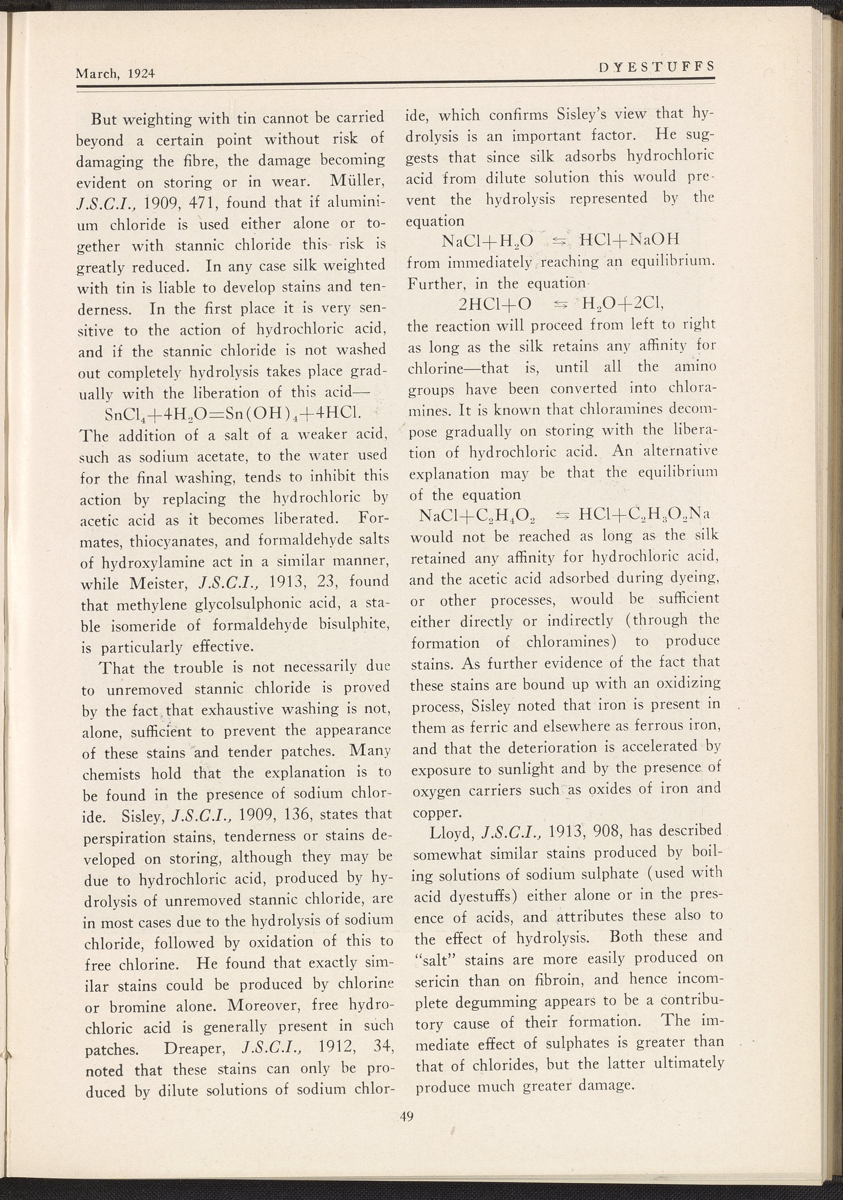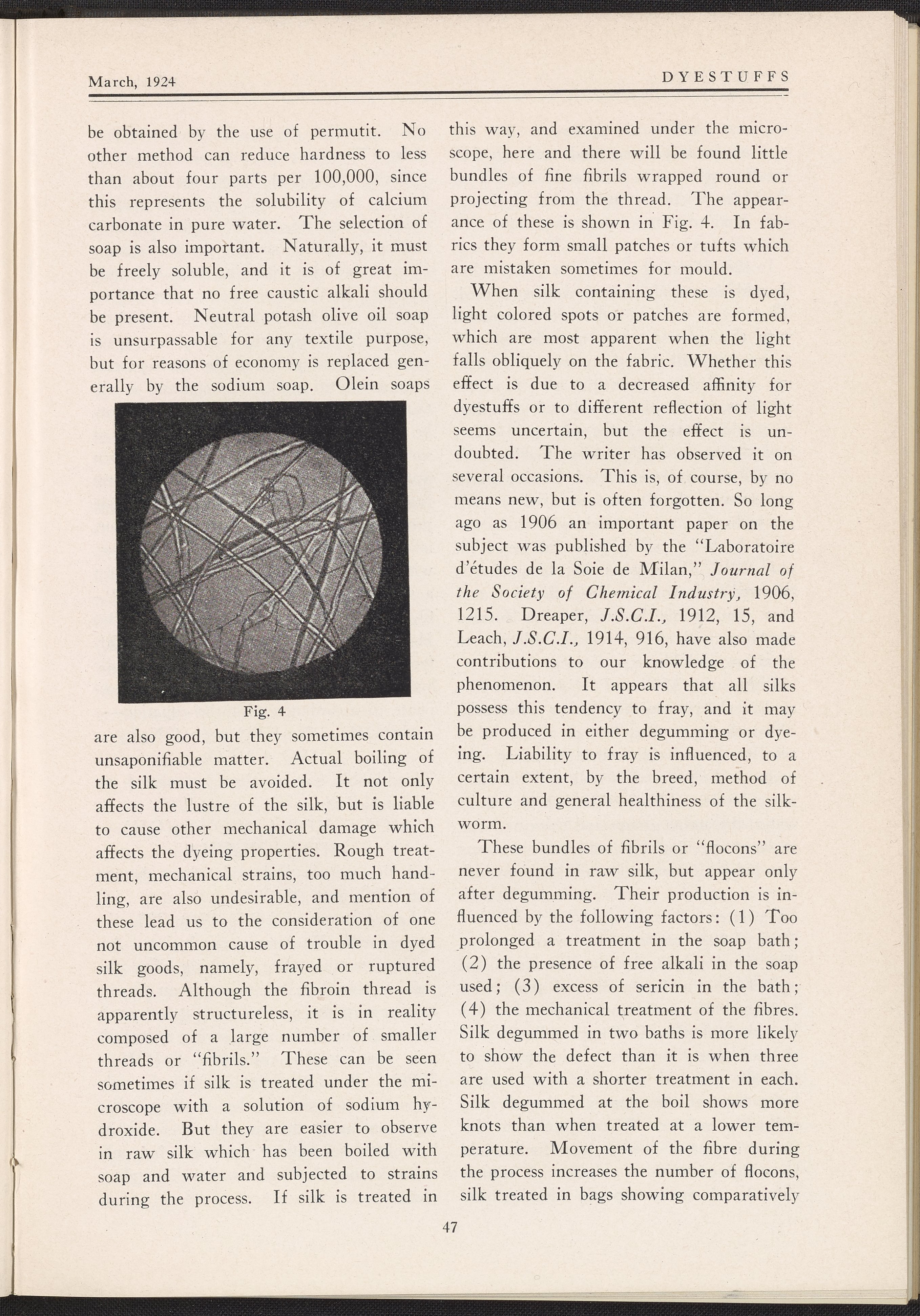 The journal contains reprints of select articles from periodicals in the dyeing and textile fields. This issue contains articles such as Dyeing of Sweater Yarn by Louis J. Matos; Some Difficulties Connected with the Weighting and Dyeing of Skein Silk by S. R. Trotman from The Textile Recorder; Dyeing of Bolivias, Velours, and Other Napped and Pile Fabrics from Fibre and Fabric; Coloring Chrome Suede Stock; and Determining Money Value in Dyes for Paper by Leonard Mann. This issue includes black and white printed illustrations.