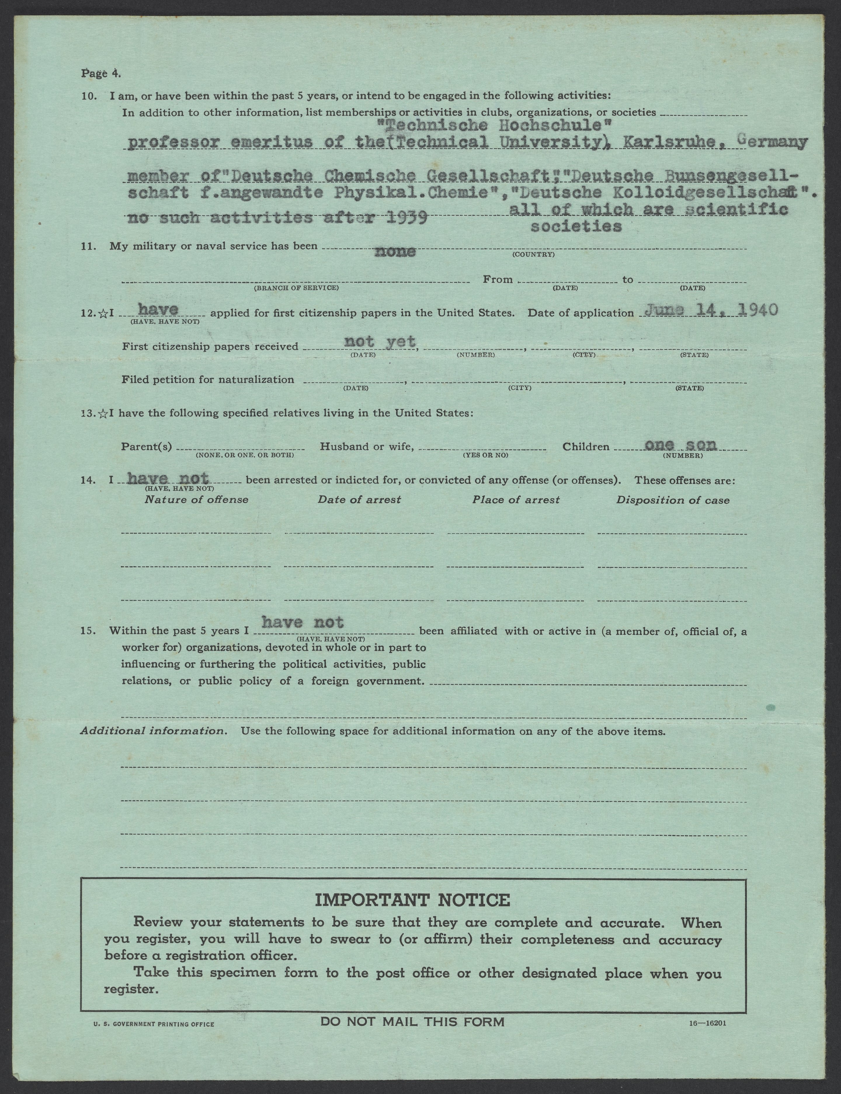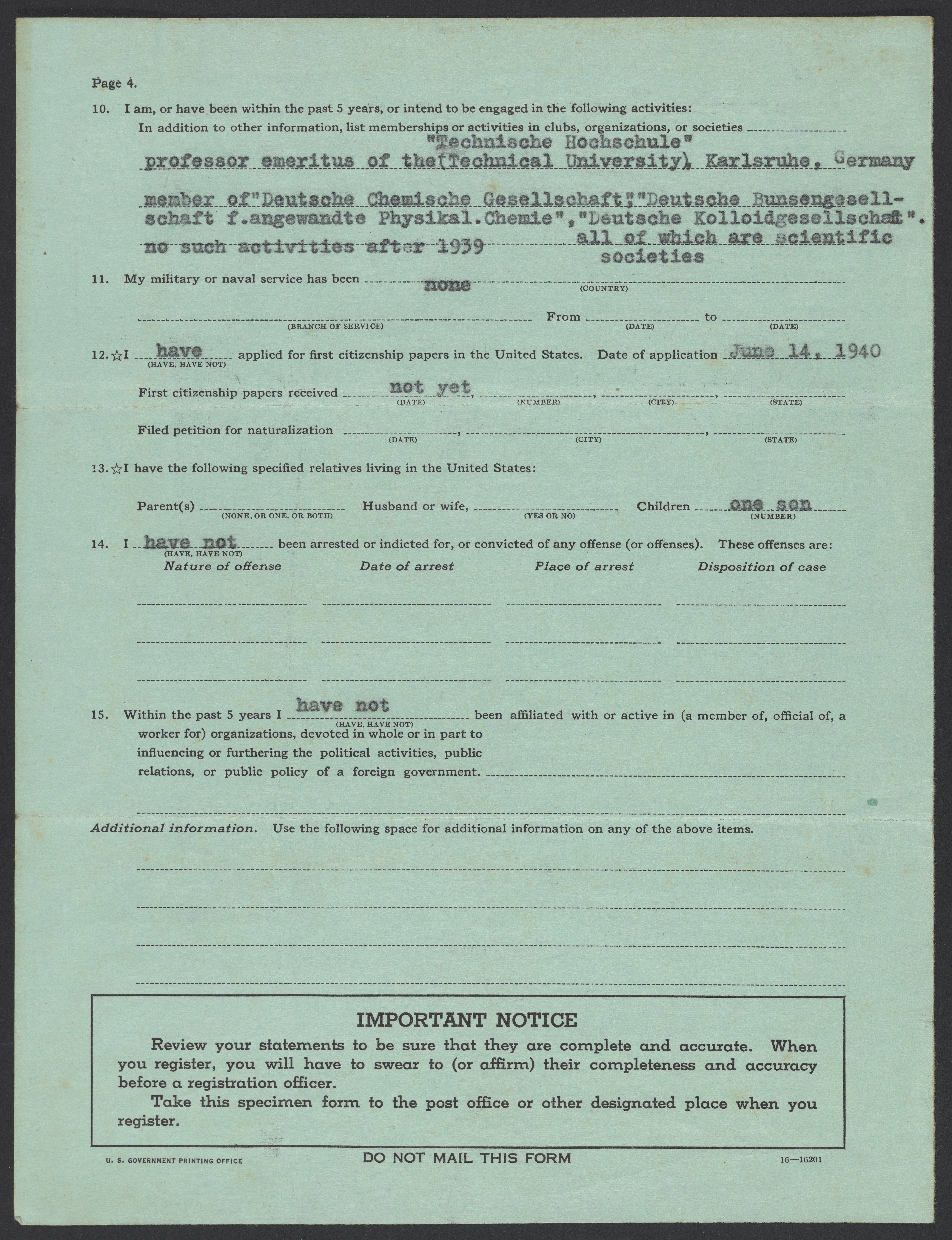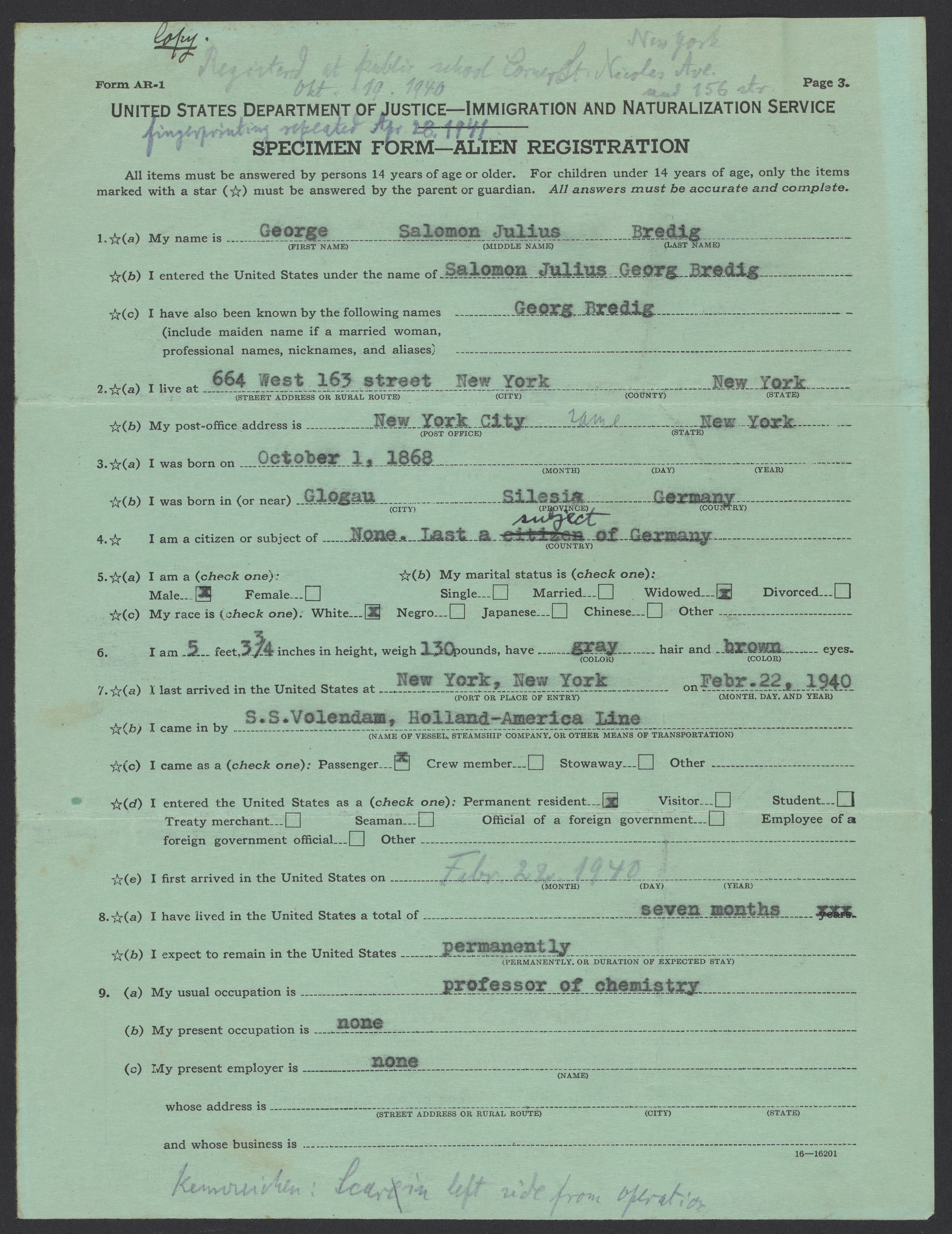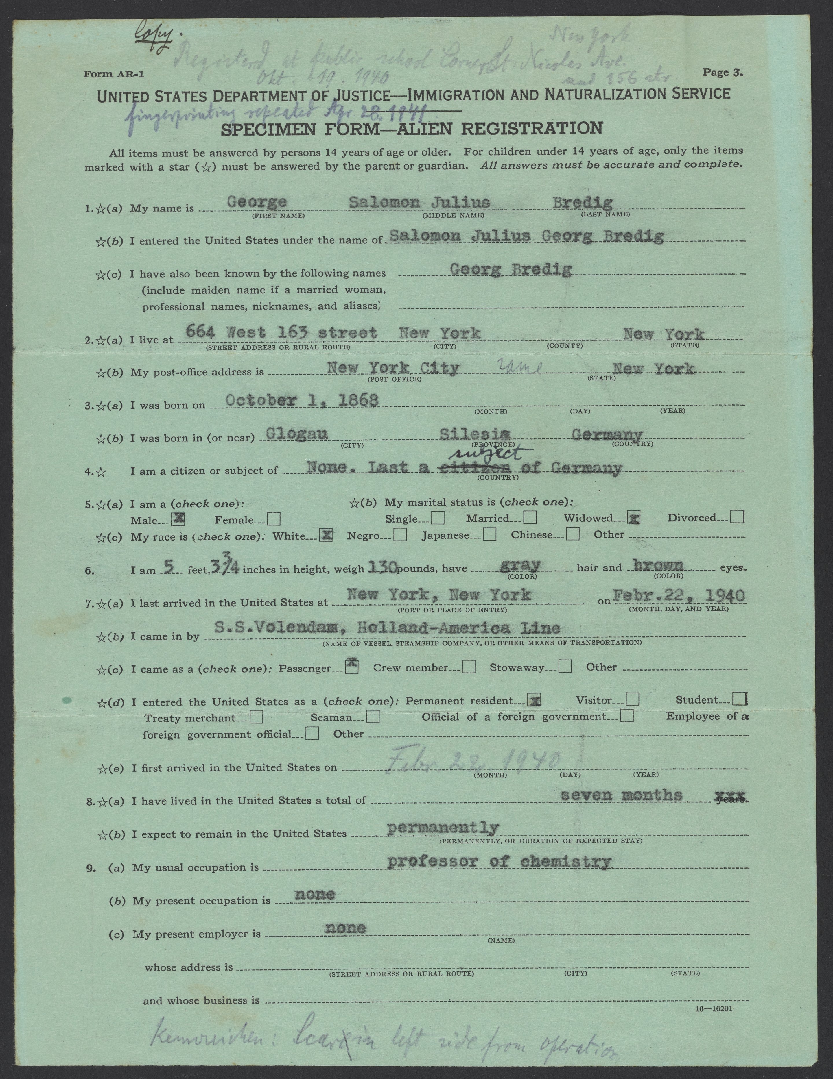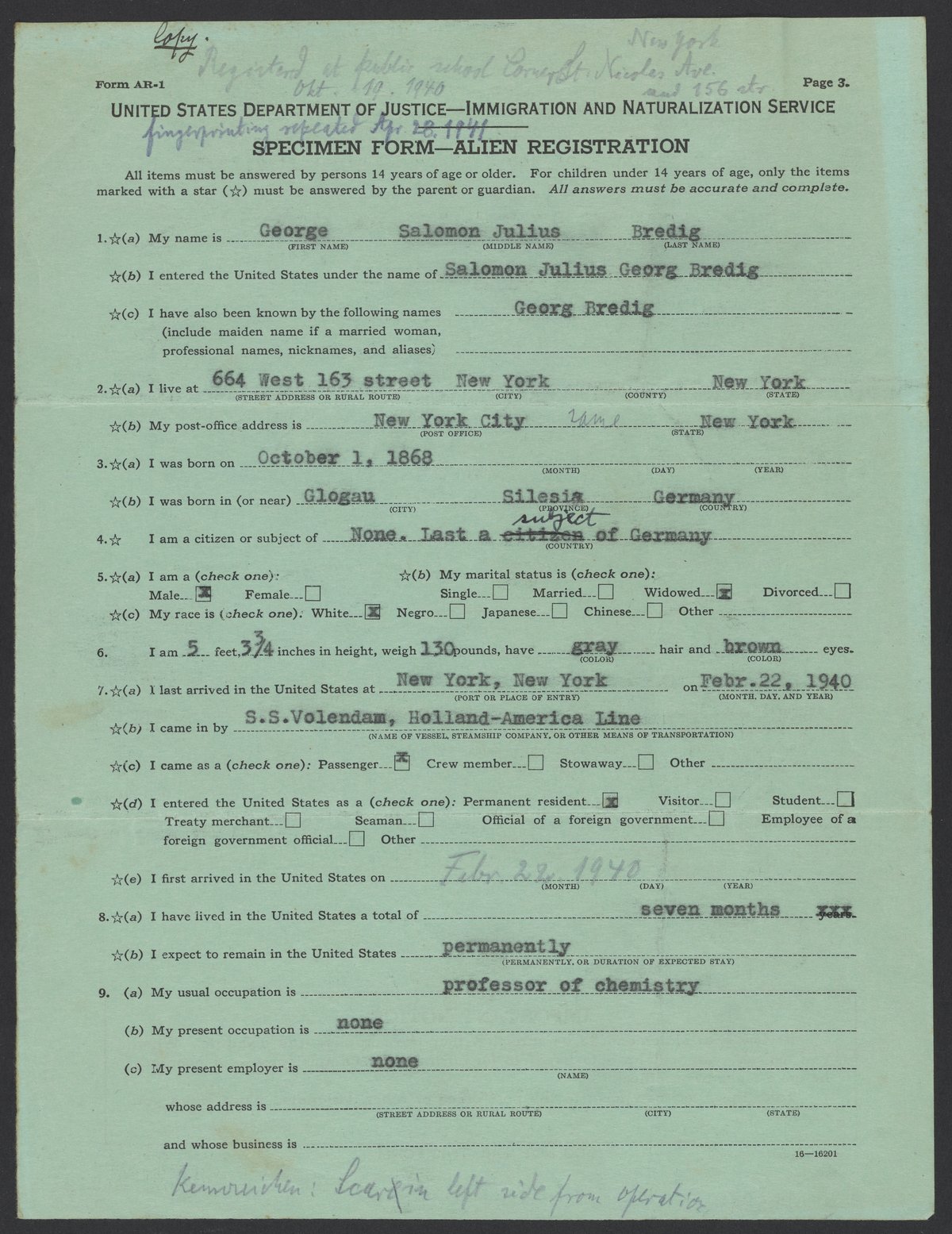 Bredig, Georg, and United States. Immigration and Naturalization Service. “The National Registration of Aliens Instructions for Registration and Specimen Form,” October 19, 1940. Papers of Georg and Max Bredig, Box 3, Folder 8. Science History Institute. Philadelphia. https://digital.sciencehistory.org/works/j0mlo38.