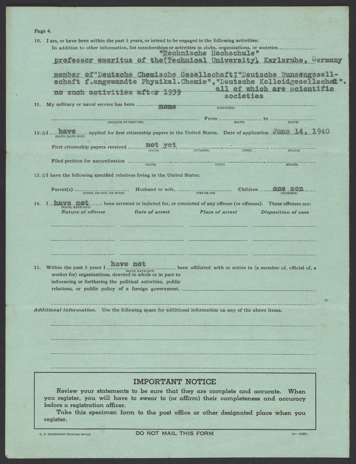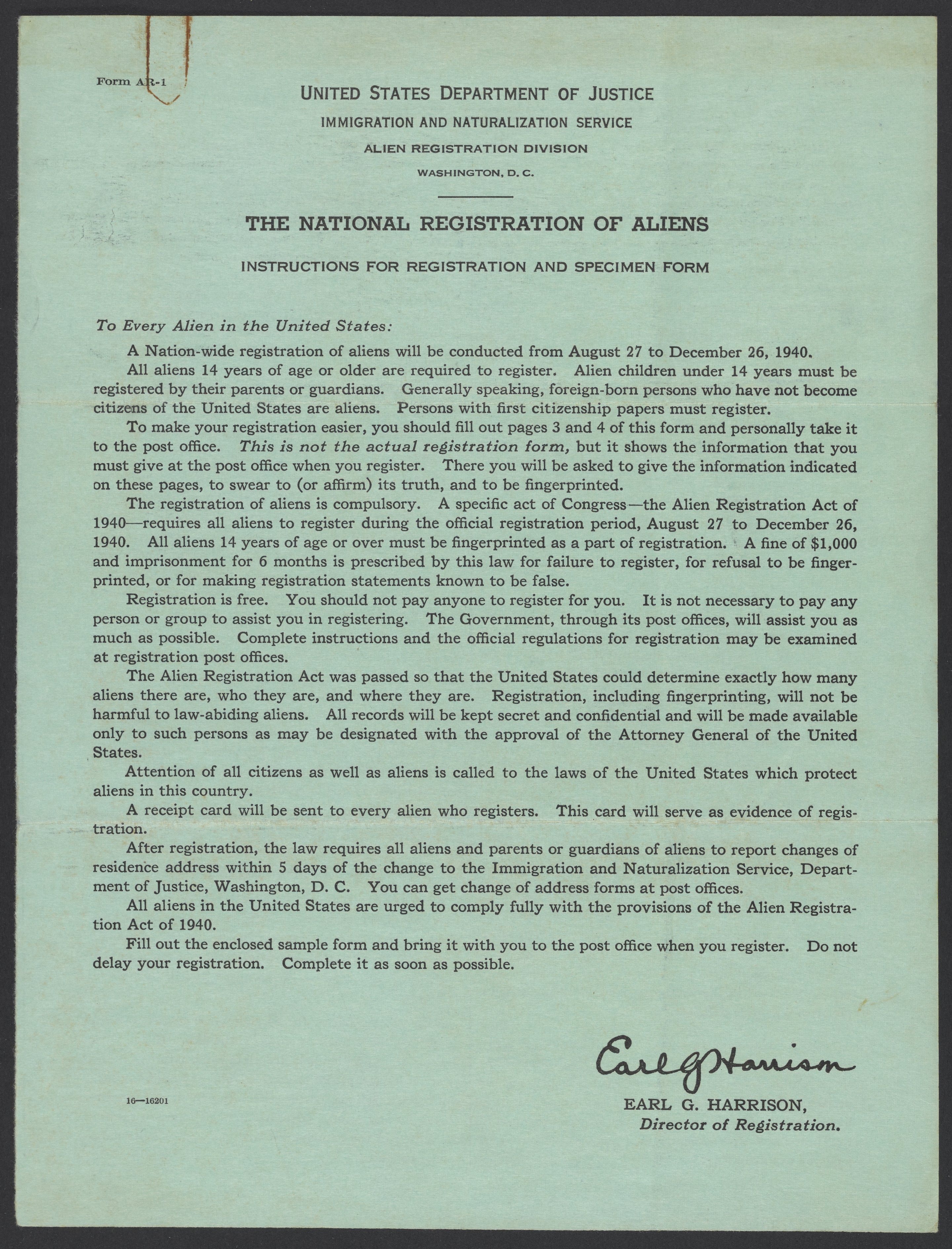 The National Registration of Aliens Instructions for Registration and Specimen Form