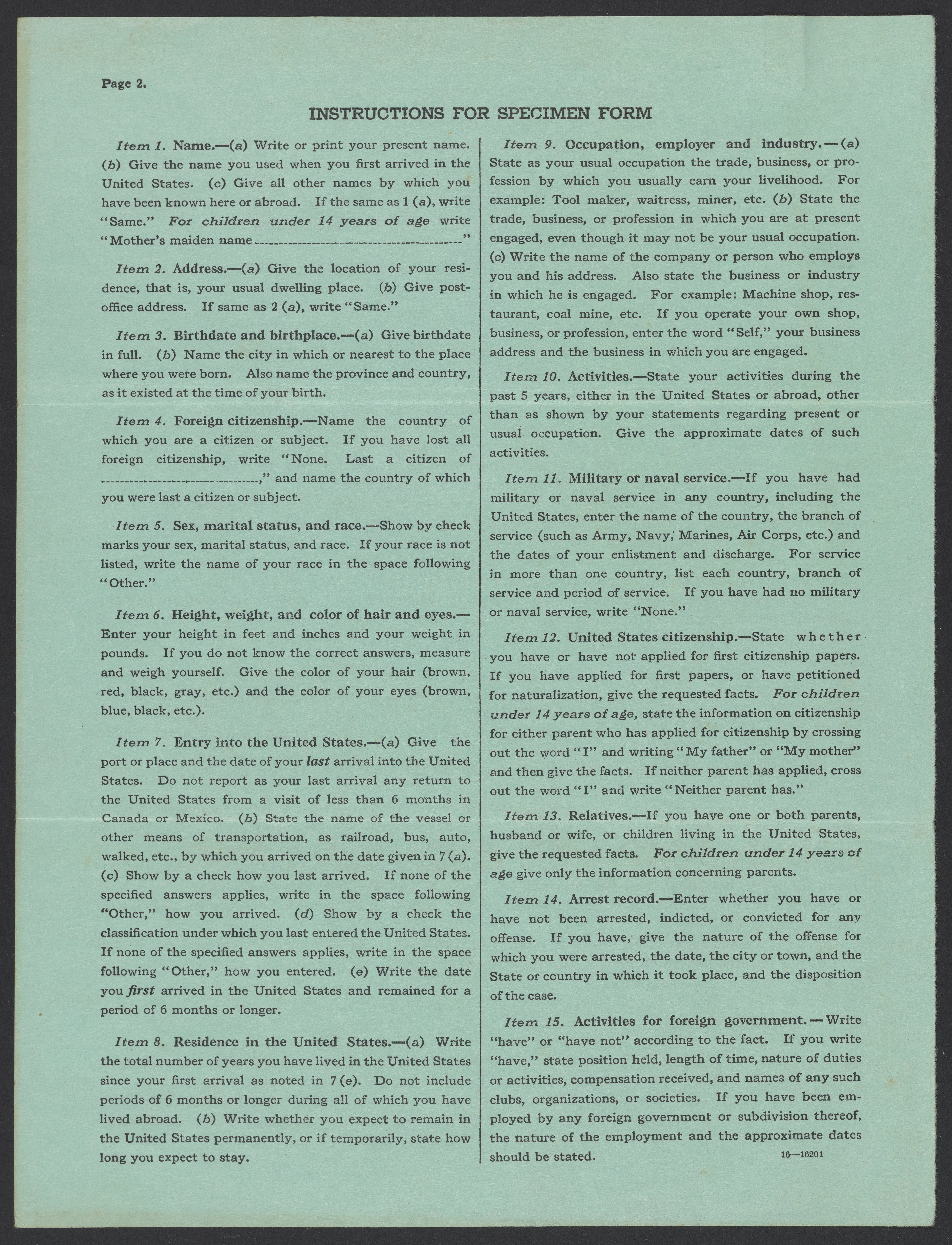 Small JPG1200 x 1574px — 372 KBLarge JPG2880 x 3777px — 1.9 MBFull-sized JPG5051 x 6624px — 5.5 MBOriginal fileTIFF — 5051 x 6624px — 95.8 MBUnited States Immigration and Naturalization Services immigrant registration paperwork belonging to Georg Bredig (1868-1944). The first page of the document are standardized instructions for filling out the form. The second page is the form, filled out by Bredig. The form includes basic information such as name, birthday, last country of citizenship, and immigation information.