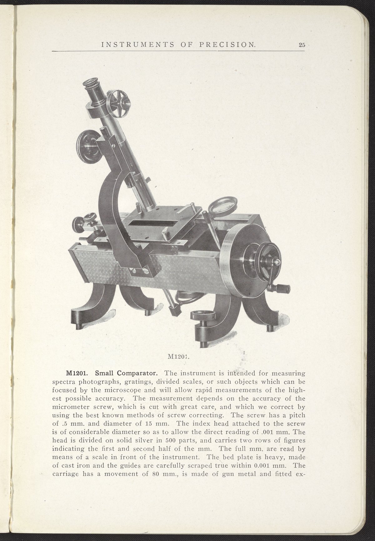 An "instrument intended for measuring spectra photographs, gratings, divided scales, or such objects which can be focused by the microscope and will allow rapid measurements of the highest possible accuracy." The design of this particular machine was suggested by Professor Edwin B. Frost of Yerkes Observatory.
