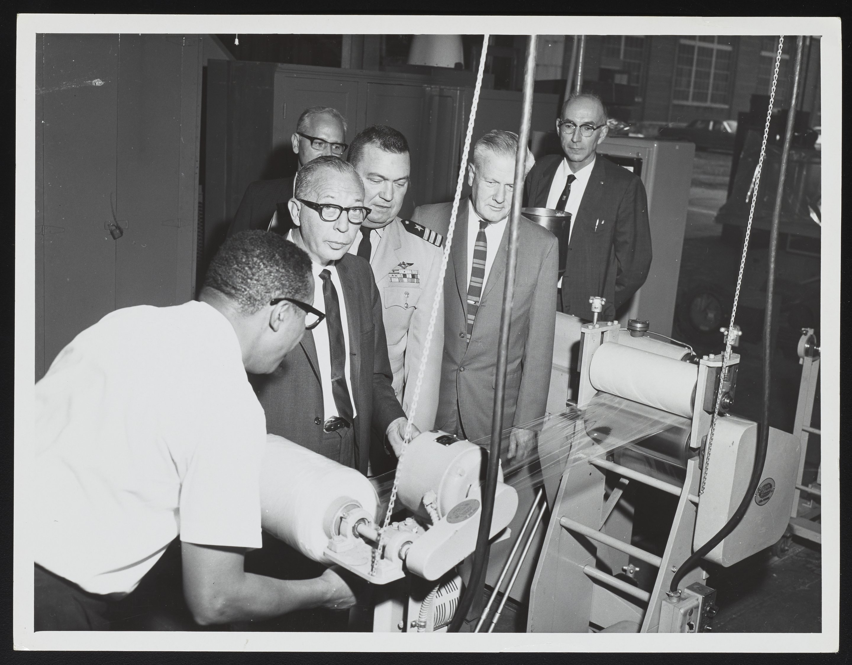 Group photograph of staff members at the Naval Air Engineering Center Polymer laboratory. At left, chemist Irving Custis is seen demonstrating a machine used in the production of polymers at the laboratory. The individuals in the photographs are identified as follows (from left): Mr. Irving Custis (Chemist); Dr. Harry Krutter (Technical Director, Naval Air Development Center); Mr. F.S. Williams (Chief Metallurgist); Dr. R.L. Abbott (Laboratory Director); Dr. G.K. Holmes (Division Superintendent); and Mr. J.H. Bowen, Jr. (Laboratory Technical Director).