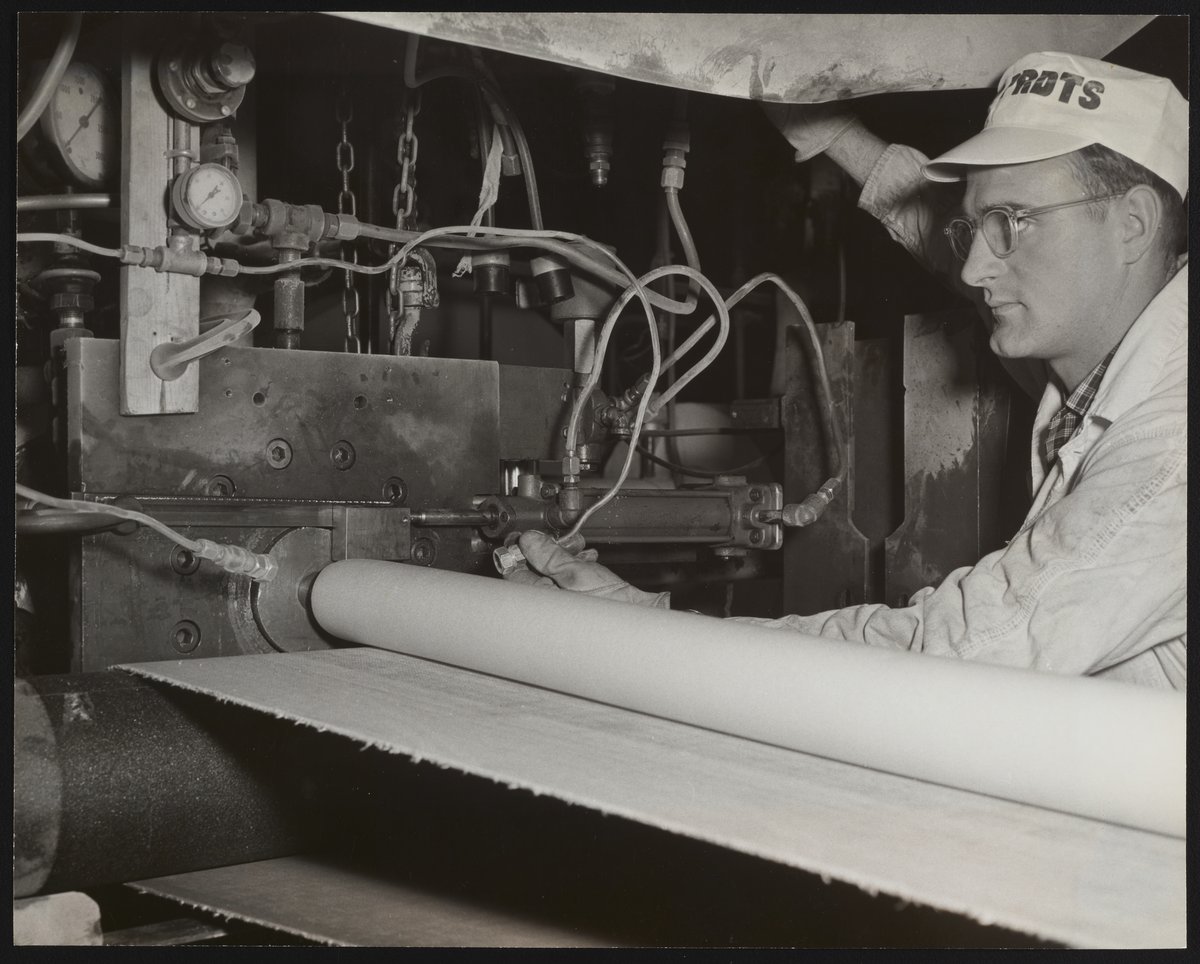 Dow Chemical Company. “Dow Employee at Saran Film Manufacturing Facility,” 1957. Dow Chemical Company Historical Image Collection, Box 10, Folder Plants--Saran Production, 1952 thru 1983. Science History Institute. Philadelphia. https://digital.sciencehistory.org/works/j3860797z.