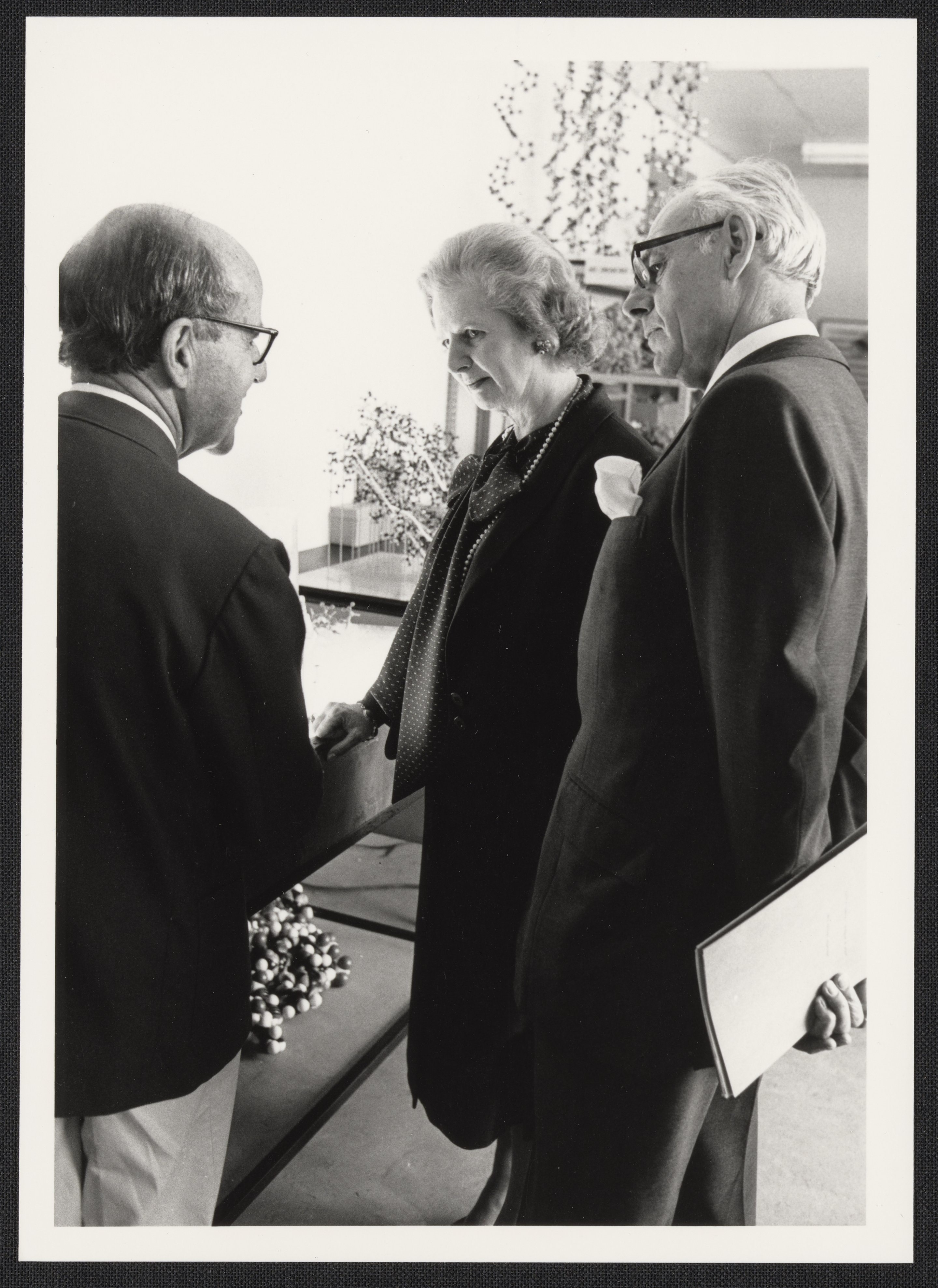 Photograph of Prime Minister Margaret Thatcher (1925-2013) and Denis Thatcher (1915-2003) meeting with Max Perutz (1914-2002) at the Laboratory of Molecular Biology (LMB).