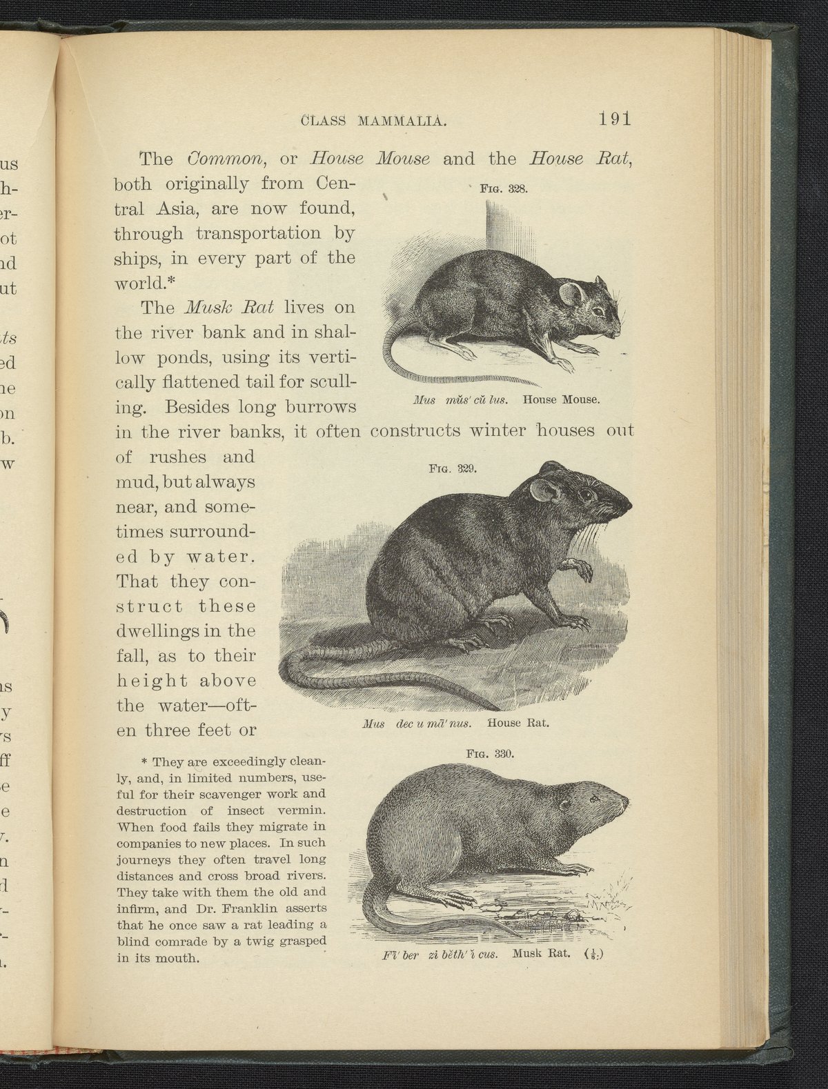 Steele, Joel Dorman, and Jenks, J. W. P. (John Whipple Potter). “Figure 328. House Mouse. Figure 329. House Rat. Figure 330. Musk Rat.” Popular Zoology. New York, New York: Chautauqua Press, 1887. https://digital.sciencehistory.org/works/j45vjm3.