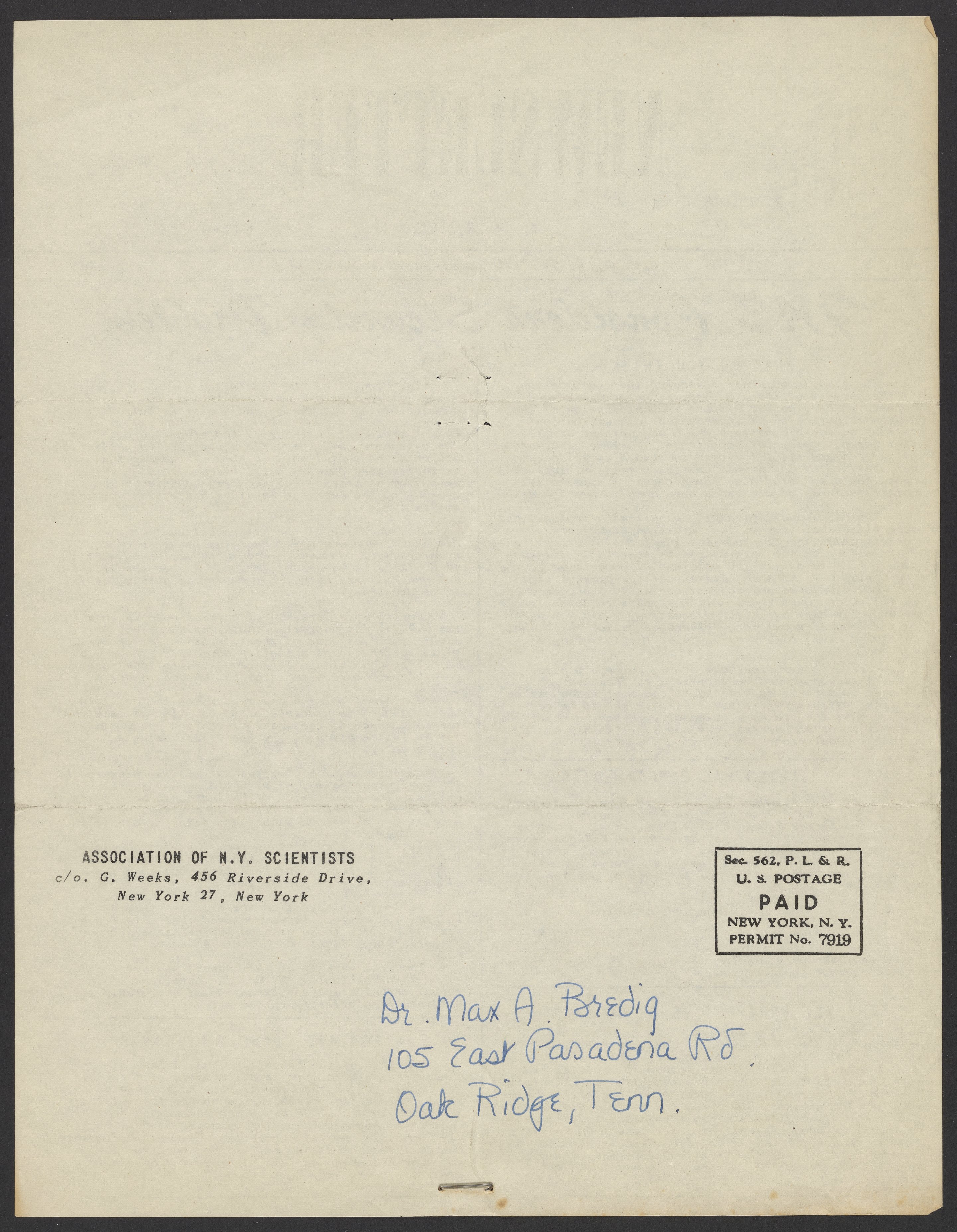 Association of New York Scientists. “Association of New York Scientists Newsletter, April 23, 1947,” April 23, 1947. Papers of Georg and Max Bredig, Box 10, Folder 3. Science History Institute. Philadelphia. https://digital.sciencehistory.org/works/j4ruiik.
