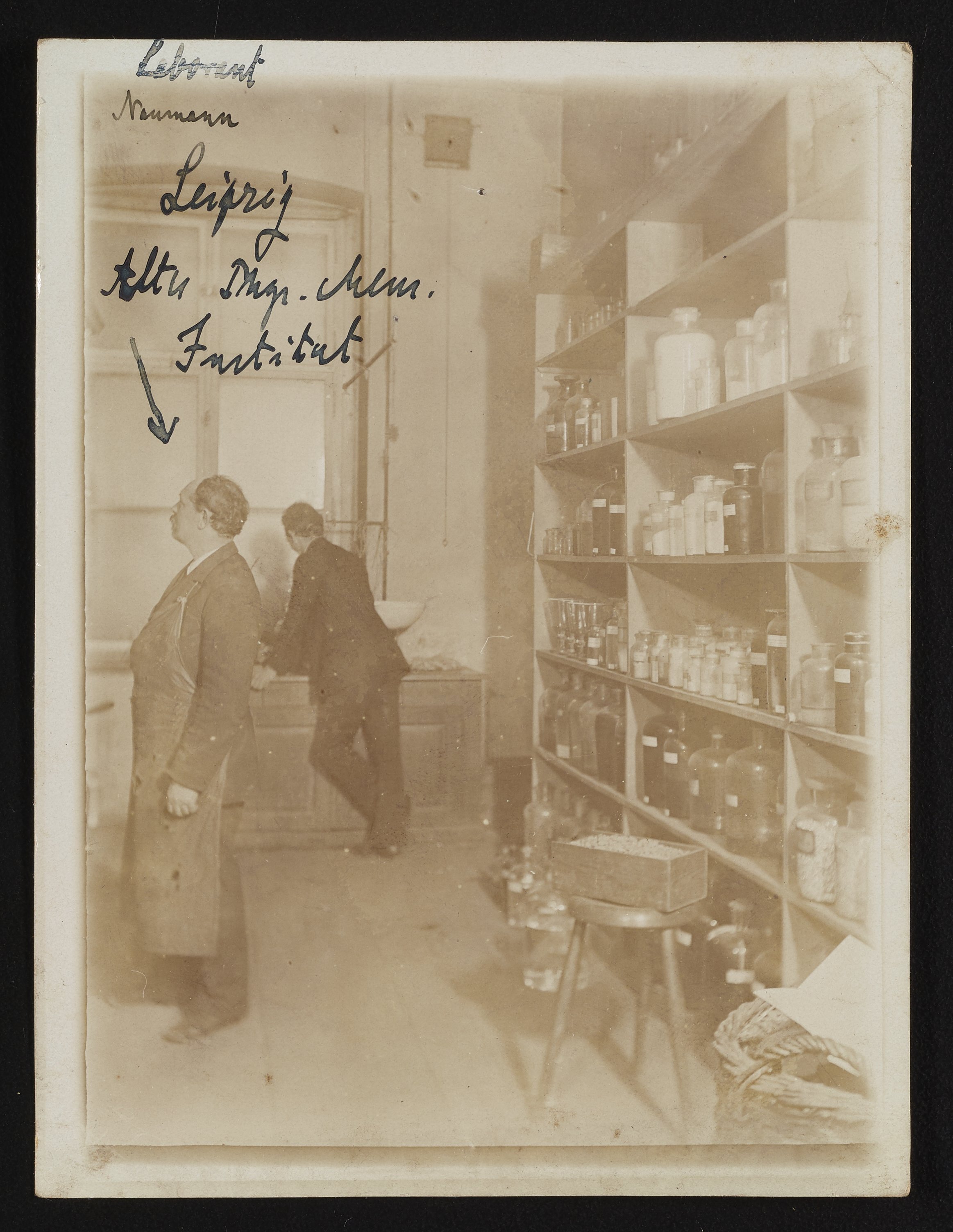 Sepia-toned and annotated photograph of two men, one identified as "Naumann," at the physical chemistry department of Leipzig University. Behind the men are shelves with glassware.