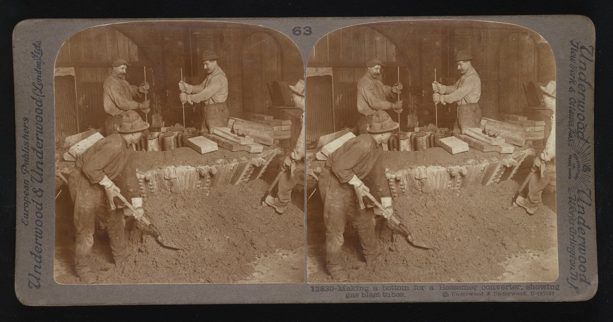 “Making a Bottom for a Bessemer Converter, Showing Gas Blast Tubes.” Underwood & Underwood, n.d. Underwood & Underwood Stereographs of Manufacturing Industries. Science History Institute. Philadelphia. https://digital.sciencehistory.org/works/j6731377h.