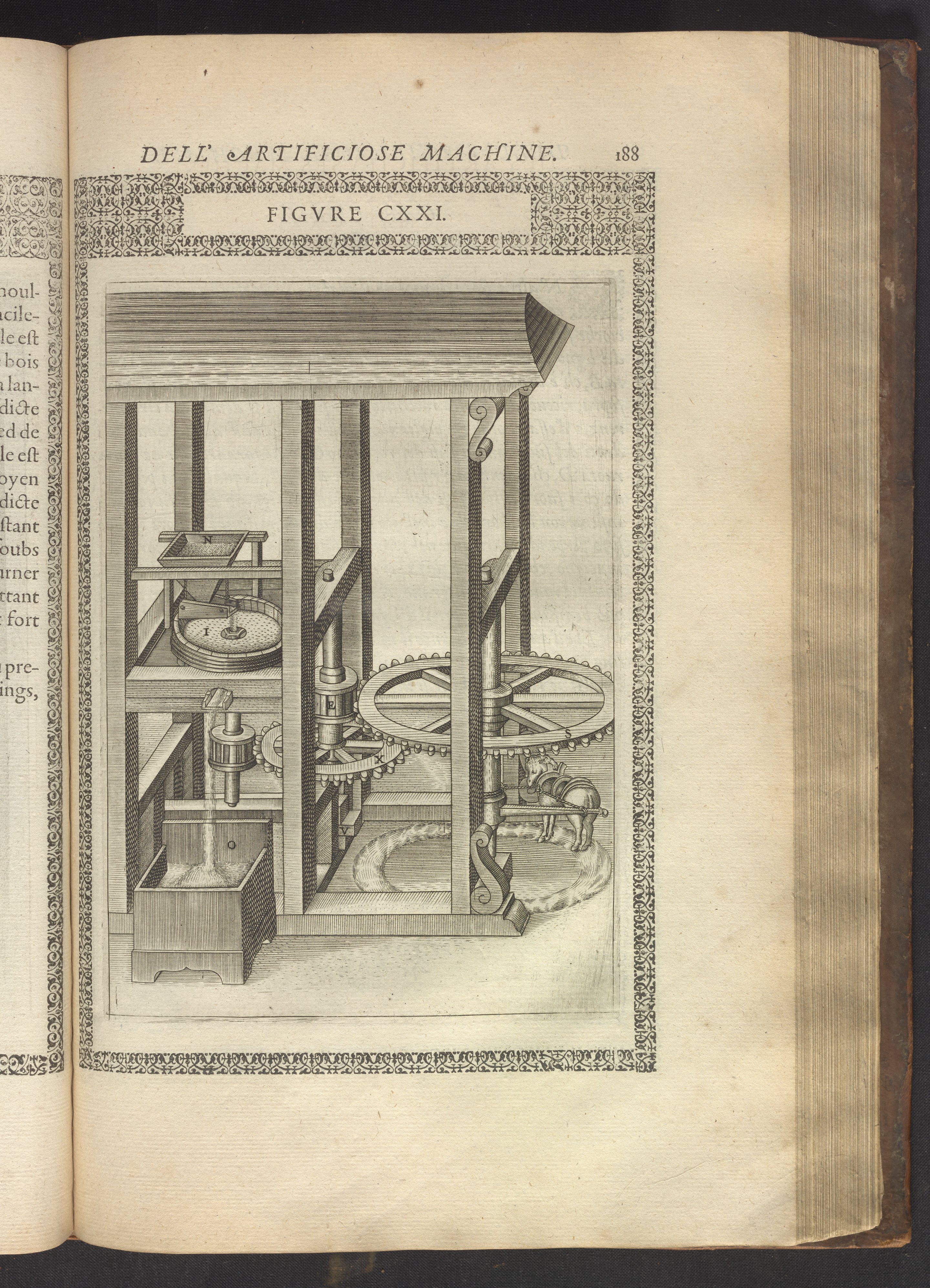 Ramelli, Agostino. “Plate 121: Grain Mill Powered by Horse.” In Le Diverse Et Artificiose Machine Del Capitano Agostino Ramelli. Paris, France, 1588. https://digital.sciencehistory.org/works/j67313970.