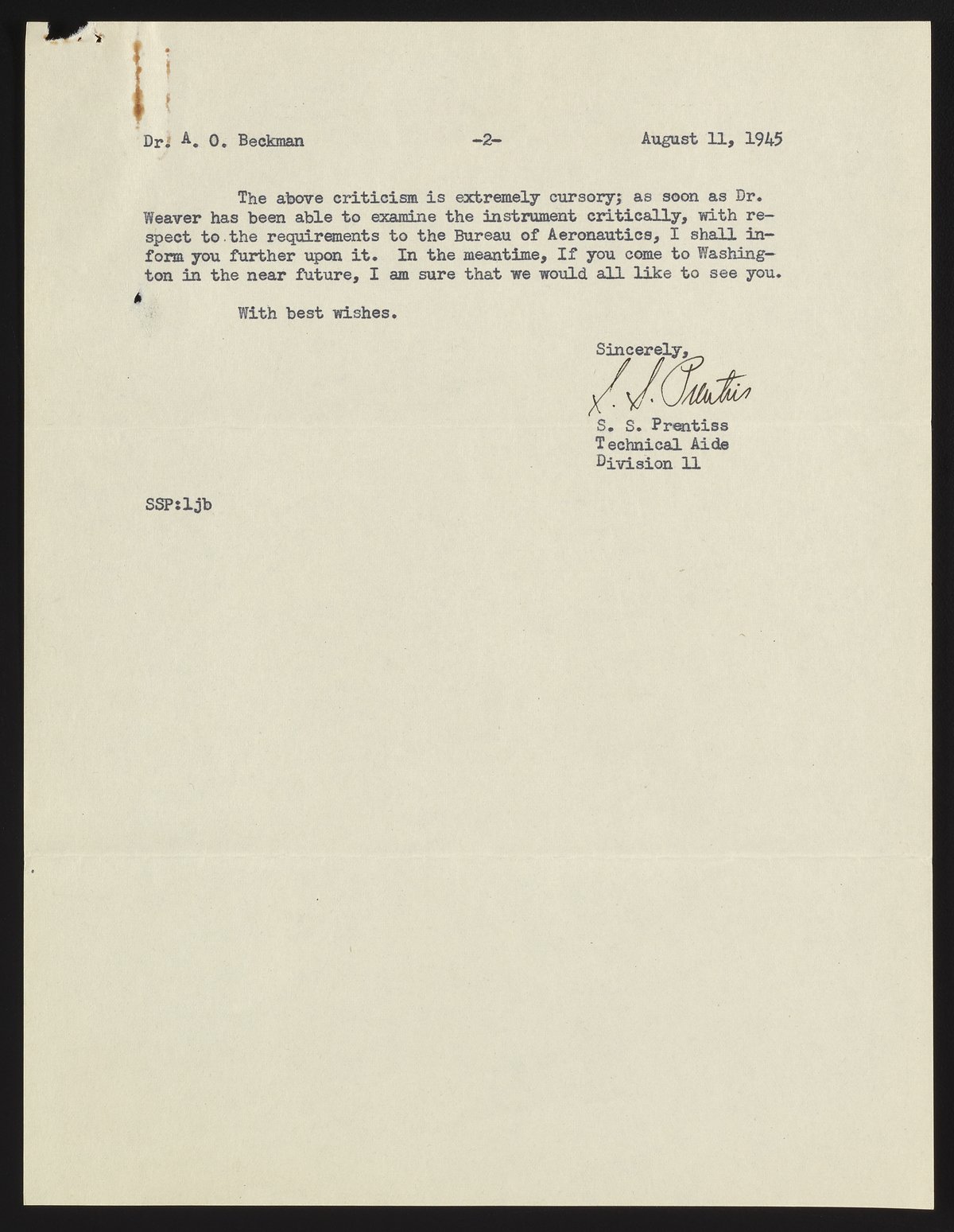 Letter from S. S. Prentiss to Arnold O. Beckman