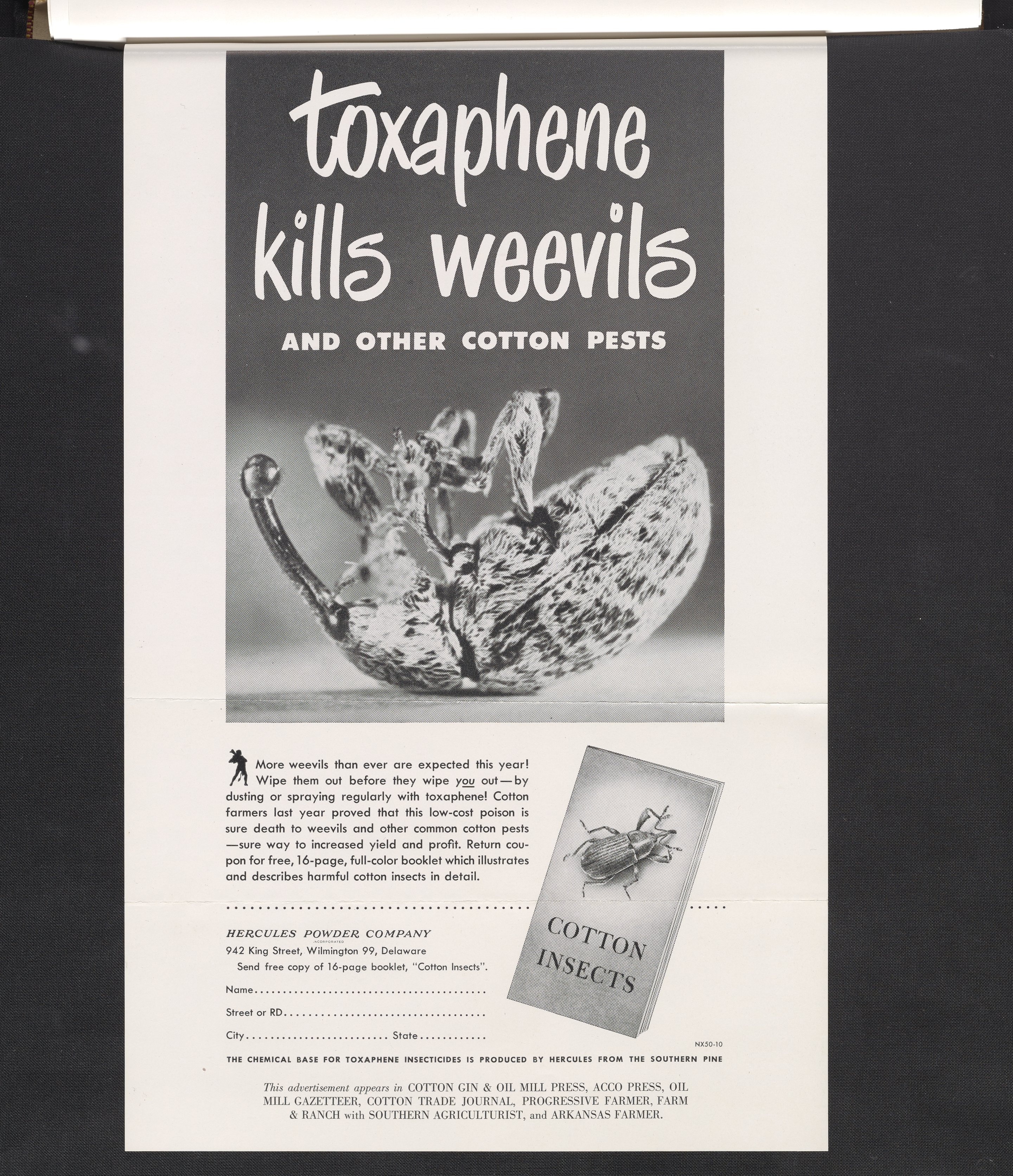 Print advertisement for toxaphene produced by Hercules Powder Company features a photograph of a dead boll weevil killed by toxaphene. A paragraph describes how the use of toxaphene will increase yields by killing insect infestations. The bottom of the ad is a tear-away coupon for a booklet on cotton insects. This advertisement appeared in Cotton Gin & Oil Mill Press, Acco Press, Oil Mill Gazetteer, Cotton Trade Journal, Progressive Farmer, Farm & Ranch with Southern Agriculturist and Arkansas Farmer.