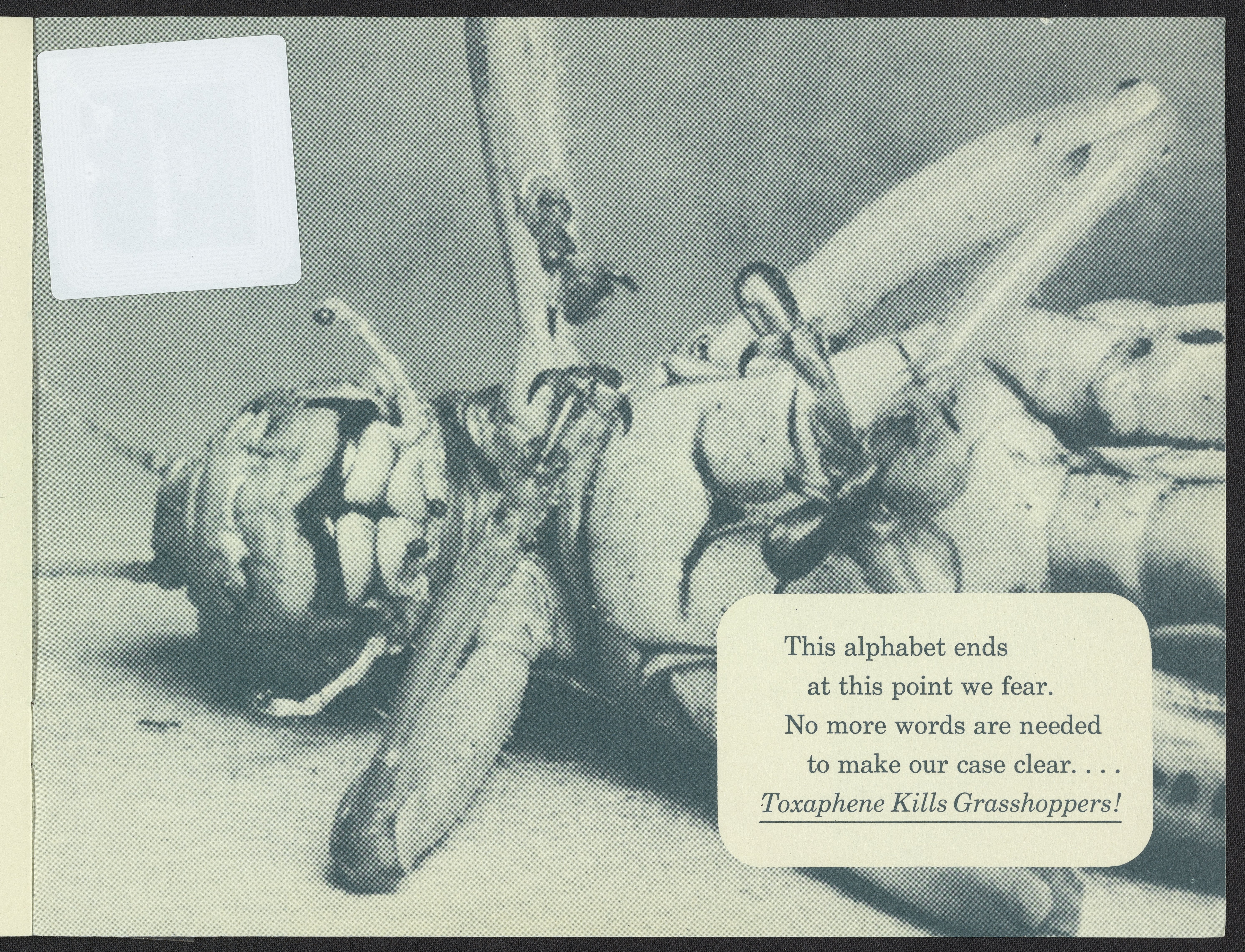 Small JPG1200 x 928px — 209 KBLarge JPG2880 x 2226px — 1.9 MBFull-sized JPG5914 x 4571px — 7.6 MBOriginal fileTIFF — 5914 x 4571px — 77.4 MBPamphlet in the form of a children's alphabet book depicts the stages of death inflicted upon a grasshopper with the use of Toxaphene pesticides produced by Hercules Powder Company.