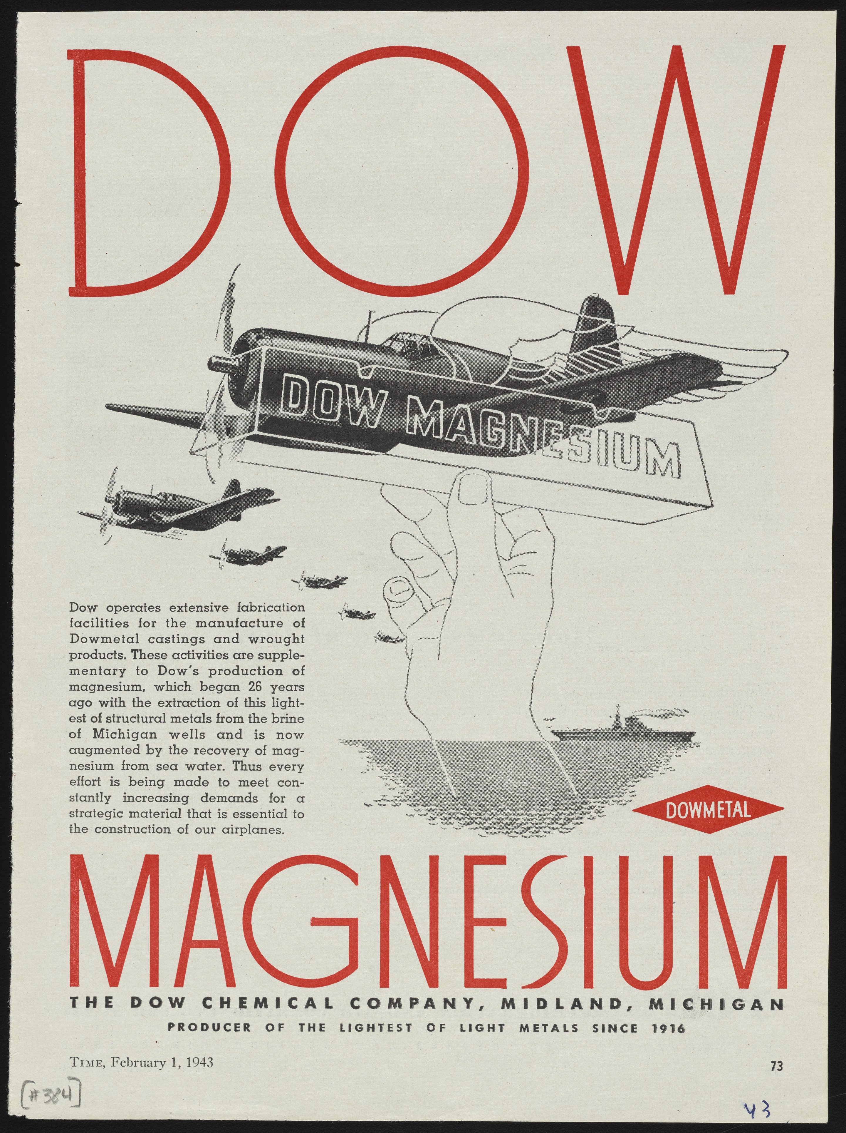 Dow Chemical Company. “Advertisement for Dowmetal Magnesium,” February 1, 1943. Advertisements from the Dow Chemical Historical Collection, Box 8. Science History Institute. Philadelphia. https://digital.sciencehistory.org/works/j7kwp71.