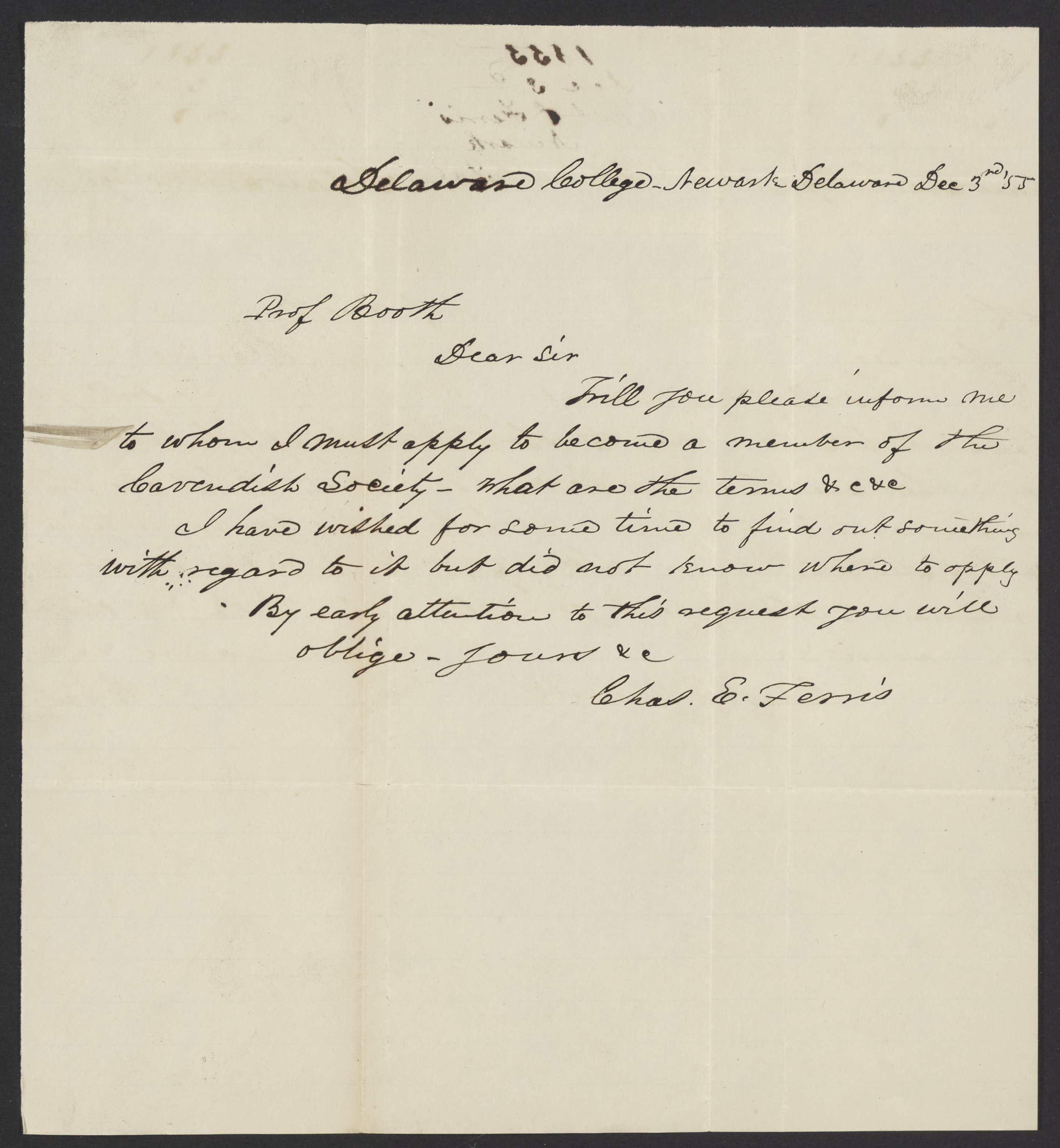 Ferris, Charles. “Letter from Charles Ferris to James Curtis Booth, December 3, 1855,” December 3, 1855. Papers of James Curtis Booth, Box 1, Folder 7. Science History Institute. Philadelphia. https://digital.sciencehistory.org/works/j8i6aq3.