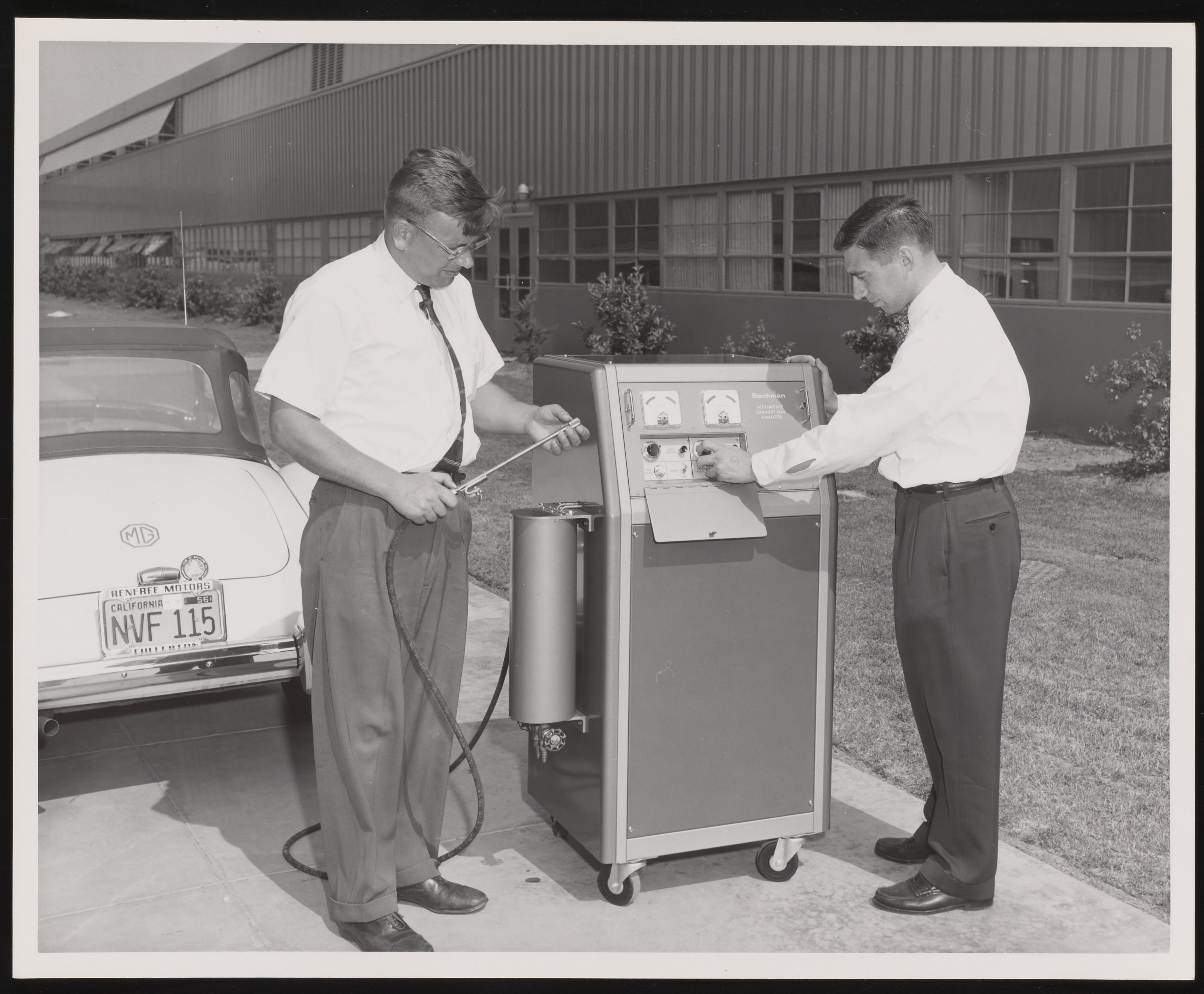 Bill Houbin and an unidentified man with Beckman Automobile Exhaust Analyzer