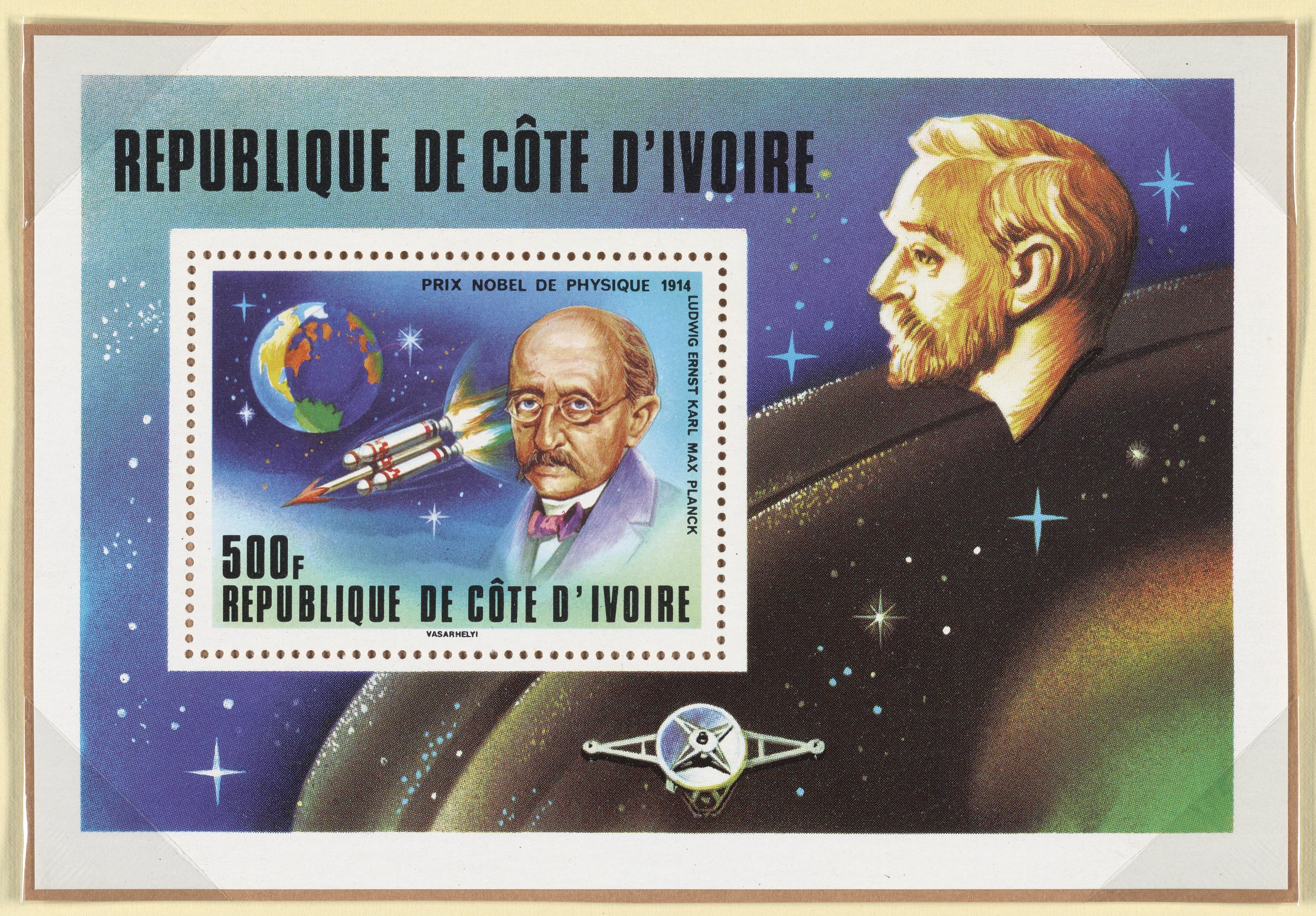 Vásárhelyi, Gyula László. “Postage Stamp on Souvenir Sheet from the Ivory Coast Commemorating Max Planck's Nobel Prize in Physics.” Côte d'Ivoire, 1978. Witco Stamp Collection, Box 3. Science History Institute. Philadelphia. https://digital.sciencehistory.org/works/j9602068s.