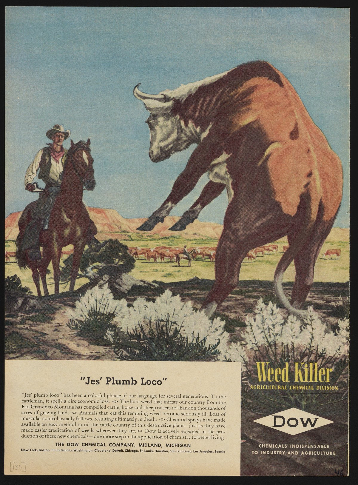 Color print advertisement for weed killers manufactured and sold by the Agricultural Chemical Division of the Dow Chemical Company for use against locoweed and other noxious plants. The advertisement features an illustration of a cattle ranch with view of a cattleman attempting to wrangle a rogue bull. The accompanying text details the harmful effects of locoweed on livestock and the use of chemical sprays to eradicate the plant.