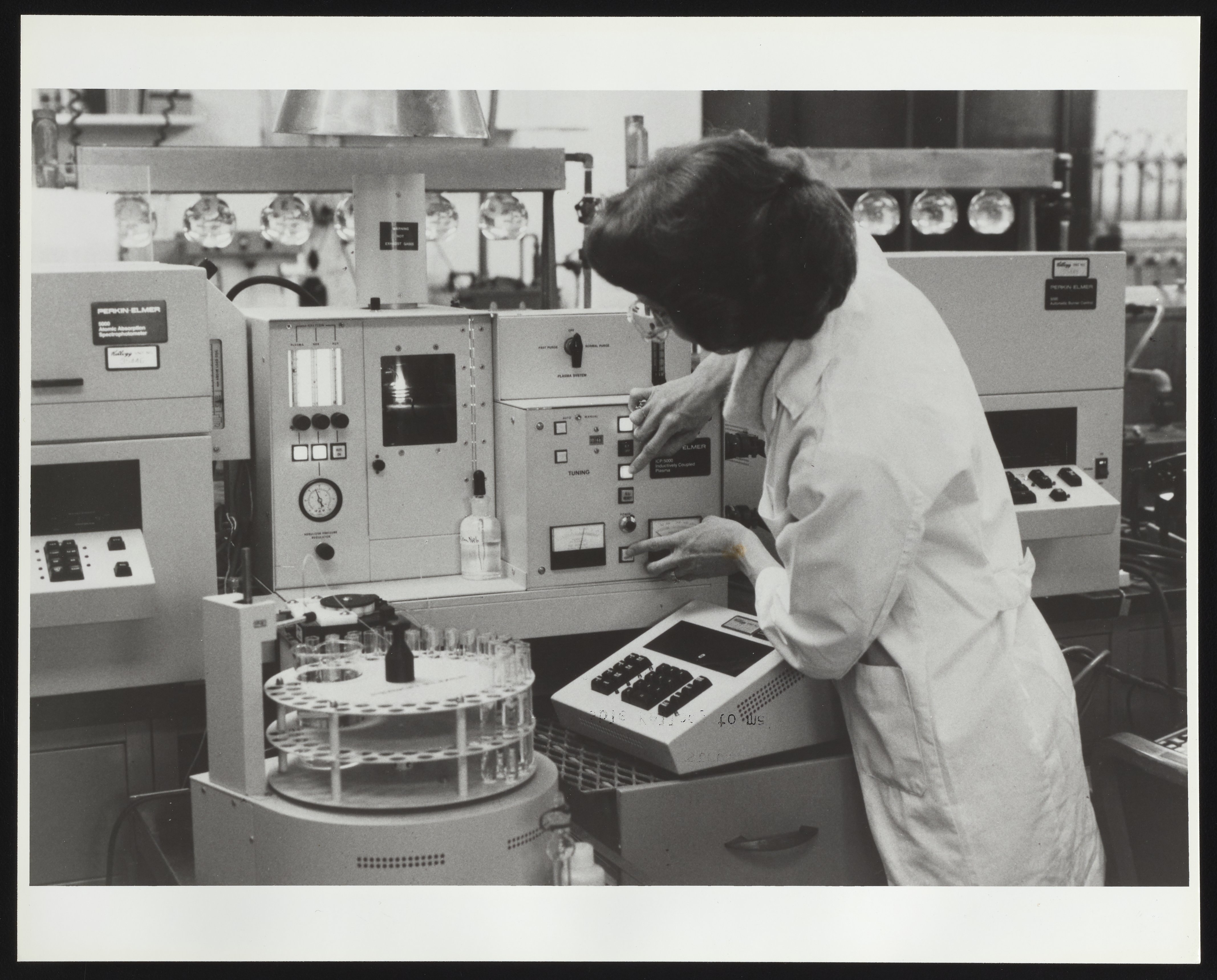 General view of an unidentified employee operating a Perkin-Elmer Model 5000 Inductively Coupled Plasma atomic emission analyzer at the Kellogg Company Corporate Quality Sciences laboratory located in Battle Creek, Michigan. Per notations accompanying the photograph, emission spectroscopy analysis, along with atomic absorption spectroscopy, was used to track the presence of trace minerals in Kellogg food products.