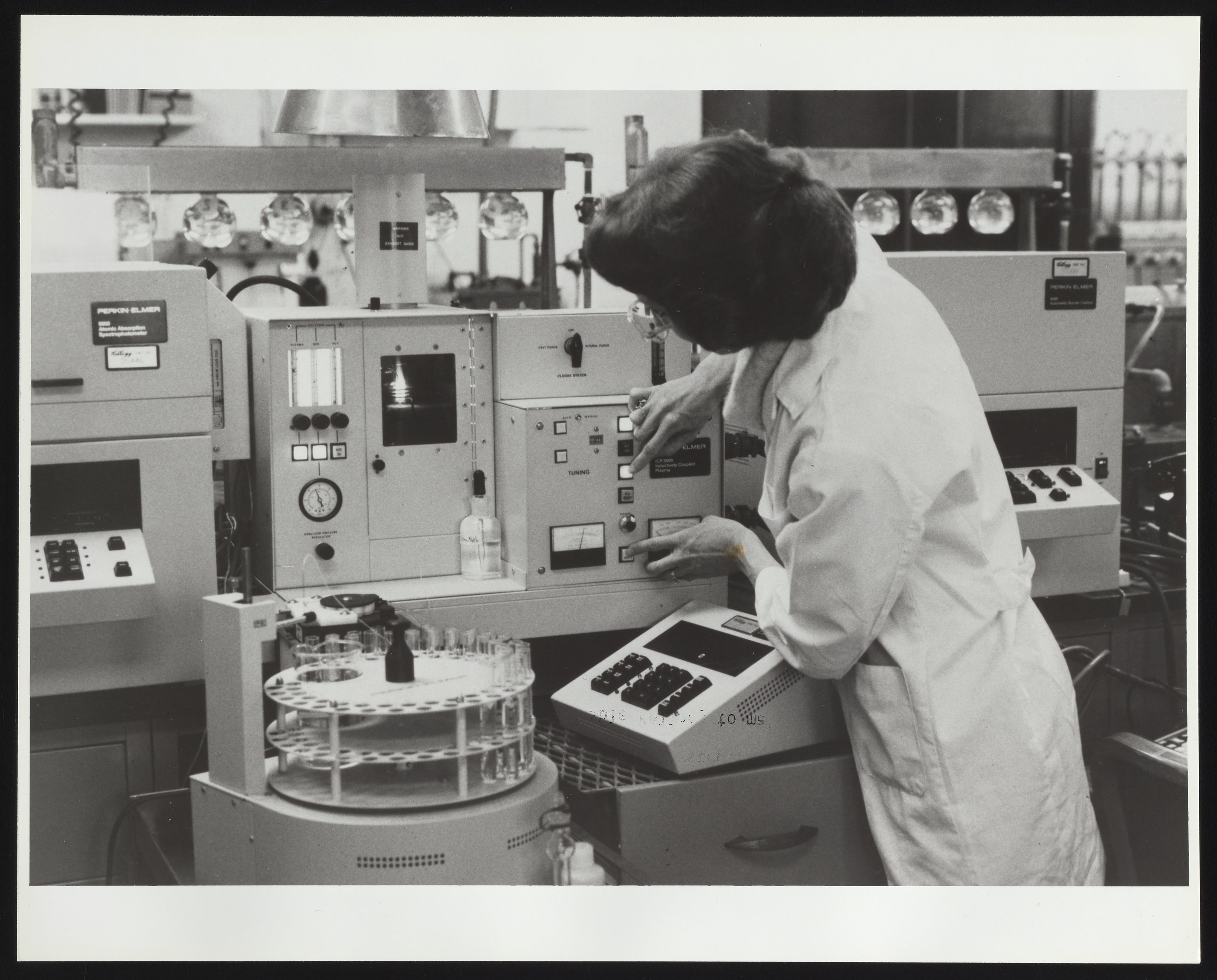 General view of an unidentified employee operating a Perkin-Elmer Model 5000 Inductively Coupled Plasma atomic emission analyzer at the Kellogg Company Corporate Quality Sciences laboratory located in Battle Creek, Michigan. Per notations accompanying the photograph, emission spectroscopy analysis, along with atomic absorption spectroscopy, was used to track the presence of trace minerals in Kellogg food products.