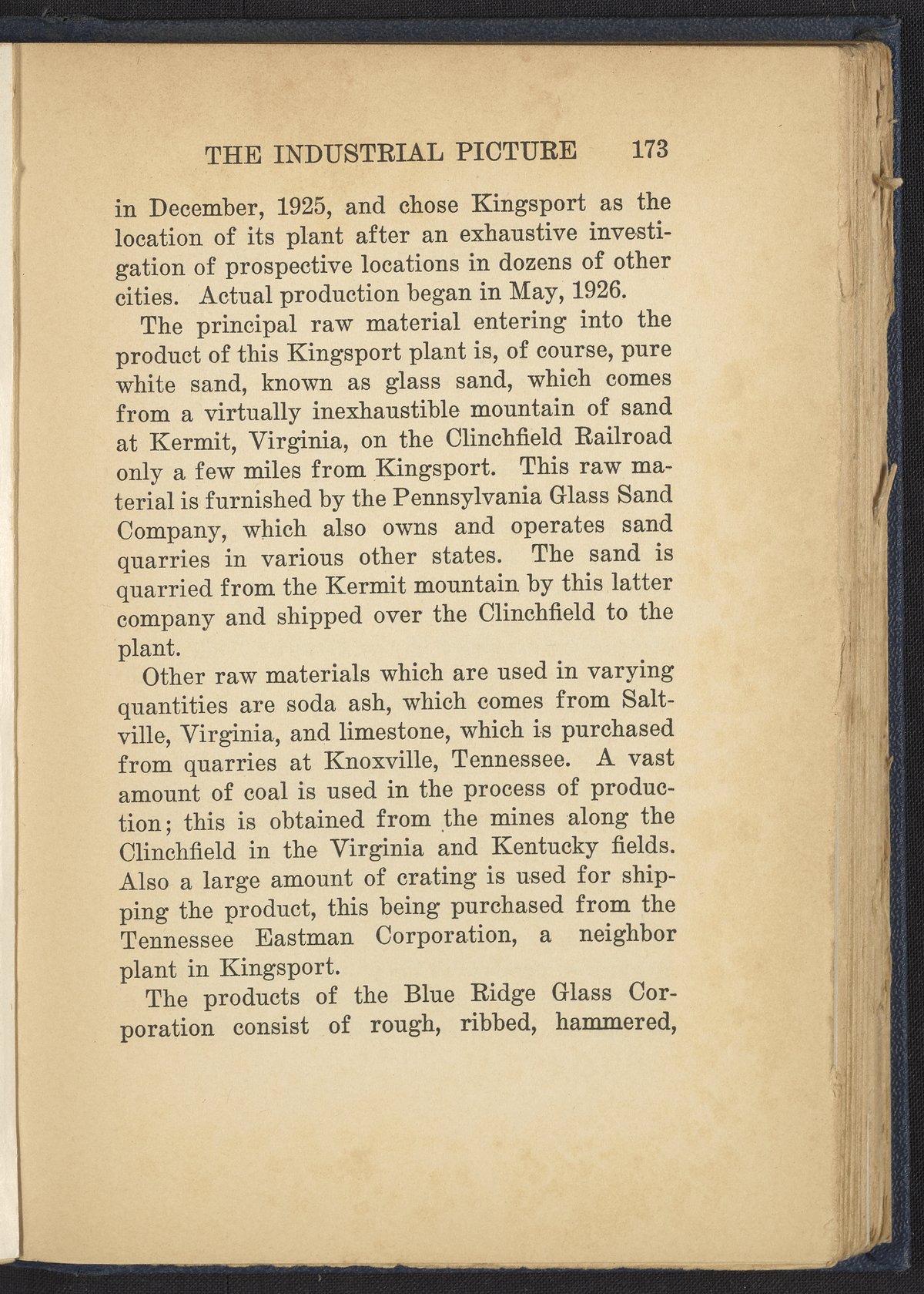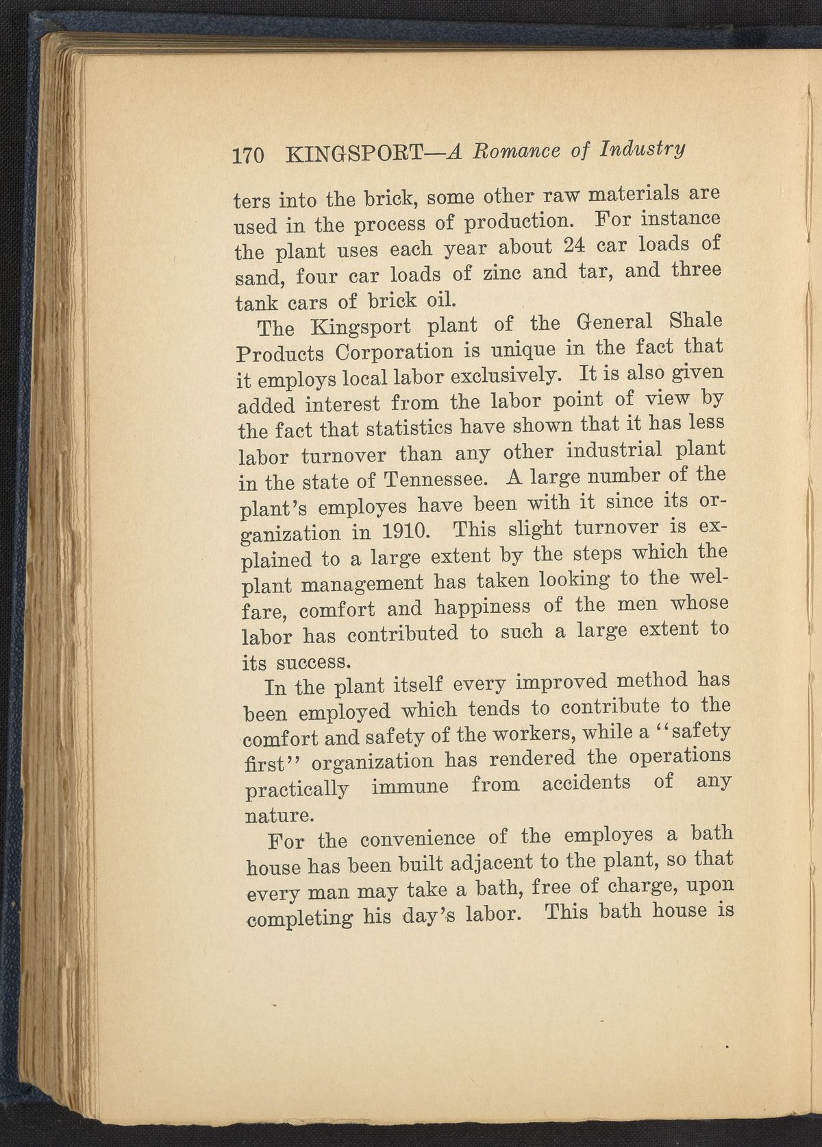 Small JPG1200 x 1685px — 503 KBFull-sized JPG2376 x 3336px — 1.7 MBOriginal fileTIFF — 2376 x 3336px — 22.7 MBA history of the development of Kingsport, Tennessee, a township home to fifteen major industrial corporations at the time of this work's publication. The work is split into three parts: Historical Background, the Building of the City, and the Industrial Picture. Includes black and white plates depicting aerial views of local industrial plants and interior warehouse views. Only the front matter and Part III of the work have been digitized.