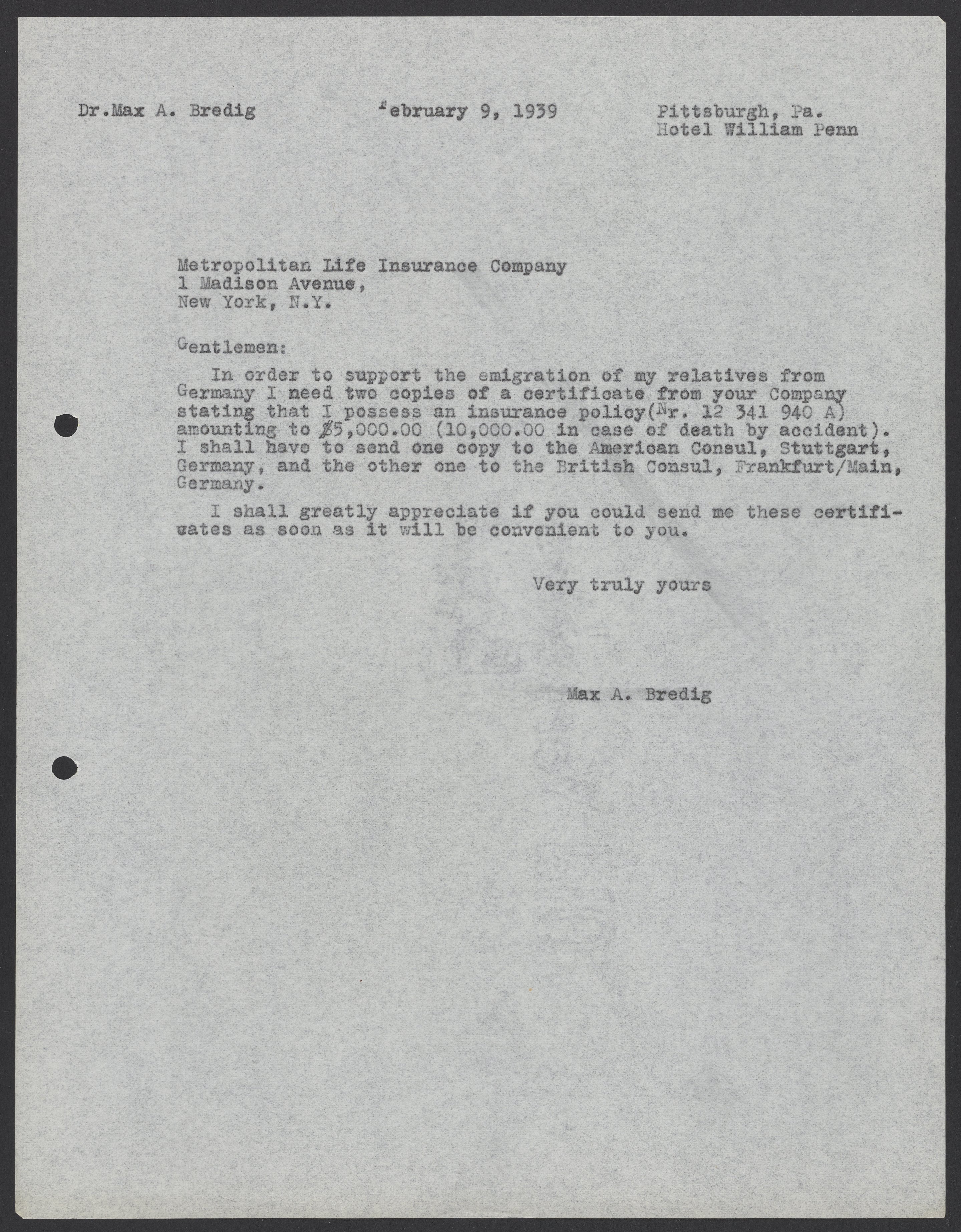Letter from Max Bredig to Metropolitan Life Insurance Company, February 9th, 1939
