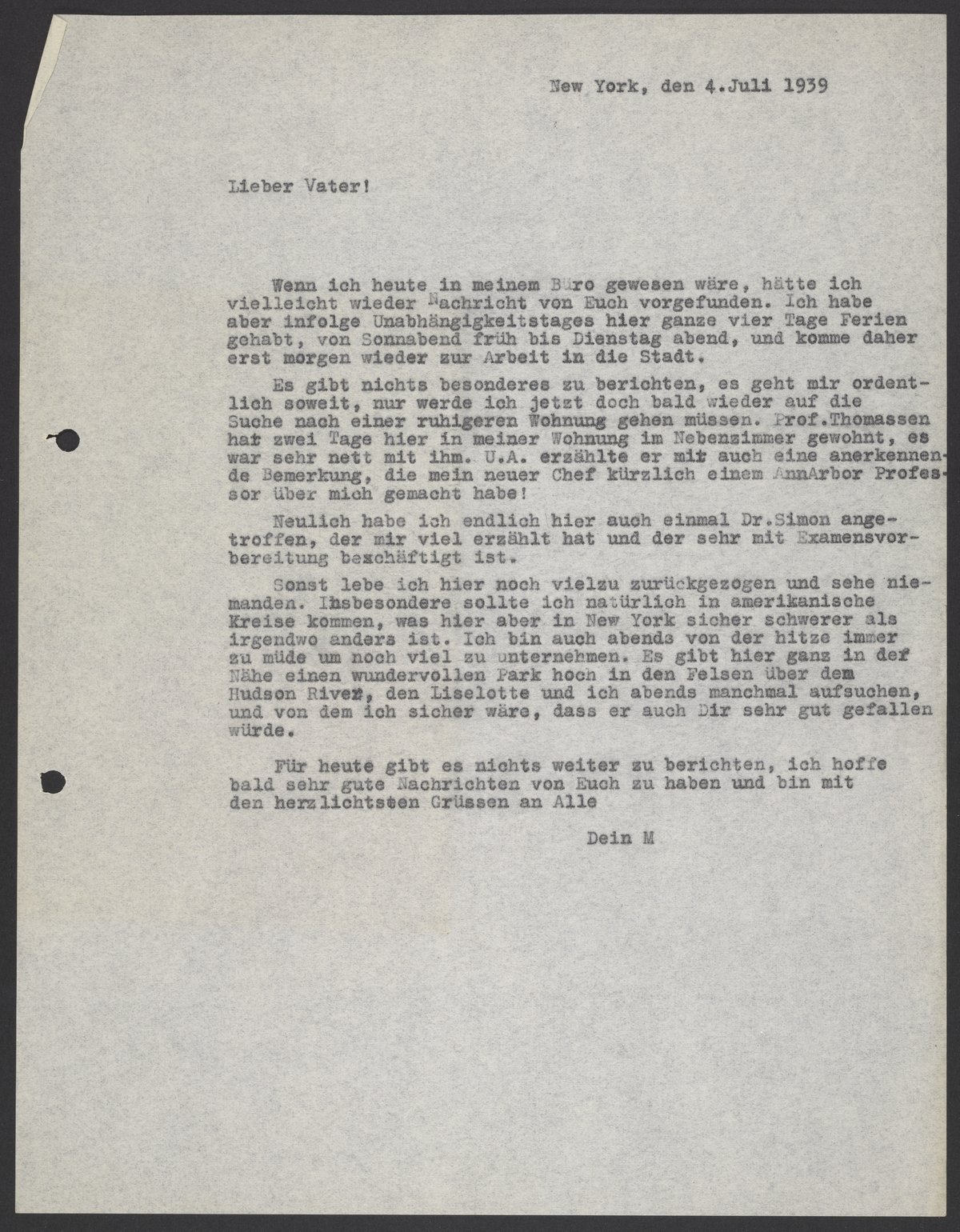 Max Albert Bredig (1902-1977) writes to his father, Georg Bredig (1868-1944) about his life in New York City.