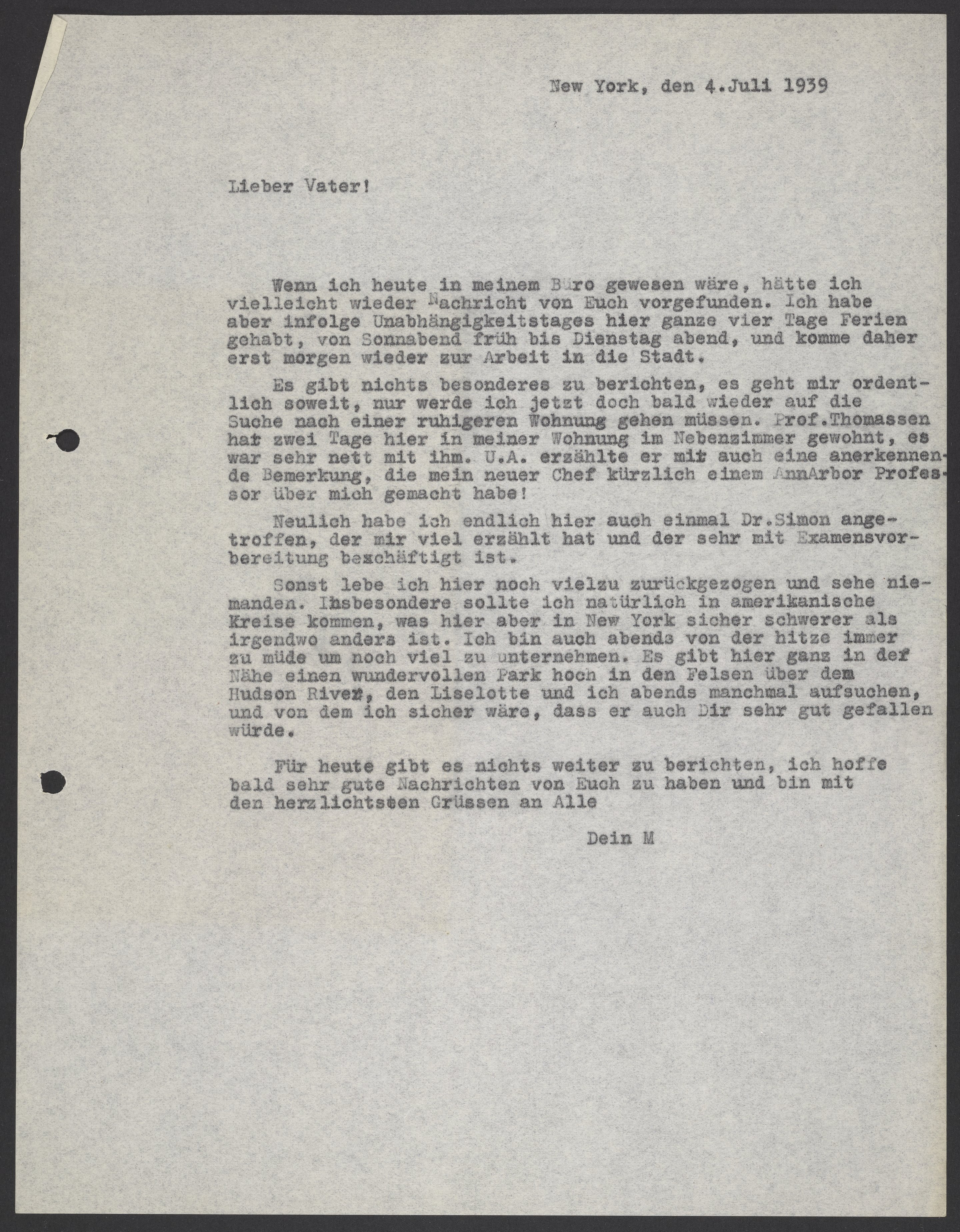 There is nothing in particular to report. I am doing well but will soon have to look for a quieter apartment again. Professor Thomassen stayed with me for two days and it was a nice visit. In addition, he also told me about a compliment that my new boss gave me in the company of a professor from Ann Arbor. I finally met Dr. Simon the other day. We had a lengthy conversation, and he is very busy preparing for exams.
