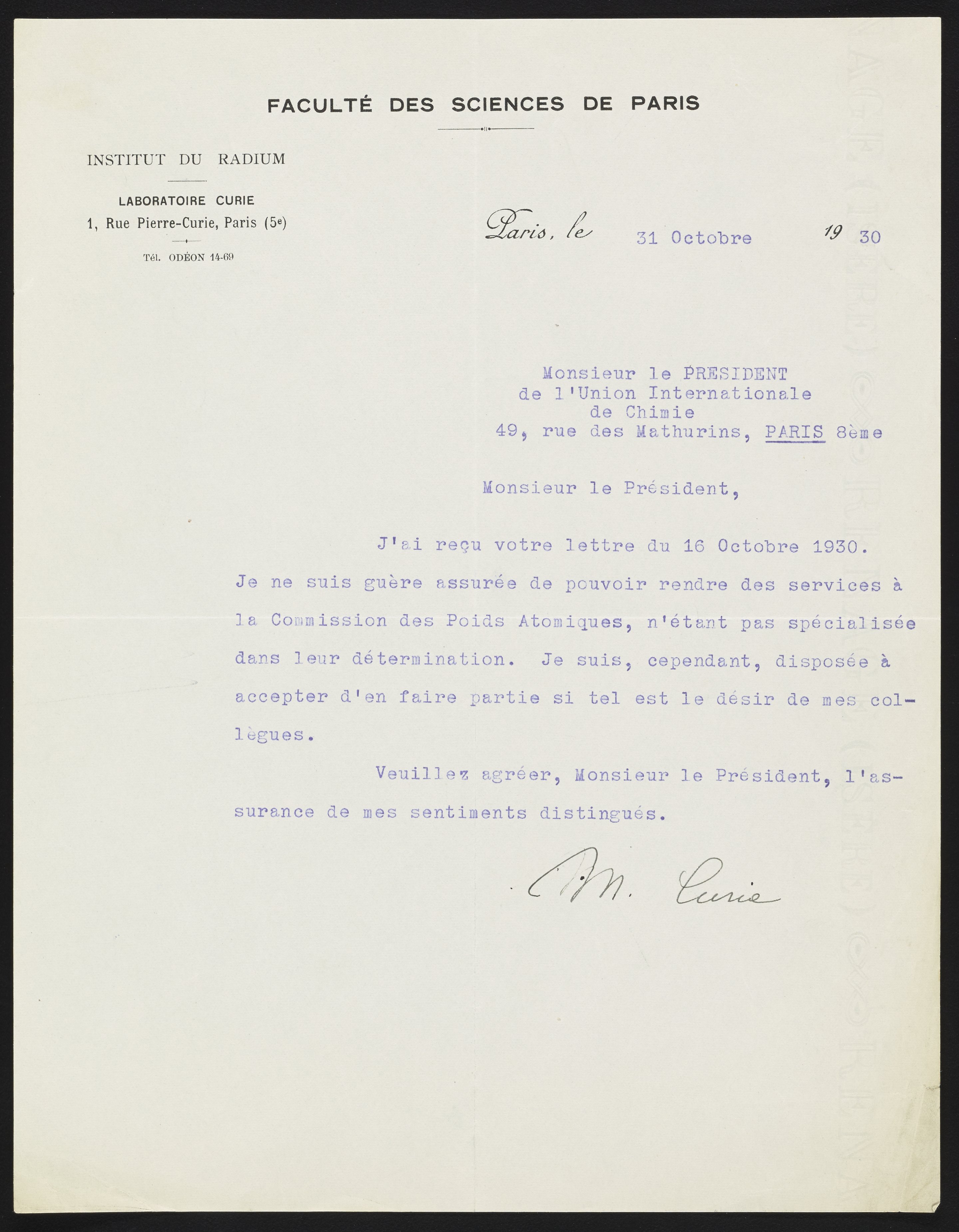 Curie, Marie. “Letter from Marie Curie to the President of the International Union of Pure and Applied Chemistry (IUPAC),” October 31, 1930. Records of the Commission on Atomic Weights and Isotopic Abundances of IUPAC, Box 13, Folder 12. Science History Institute. Philadelphia. https://digital.sciencehistory.org/works/jd472w44j.