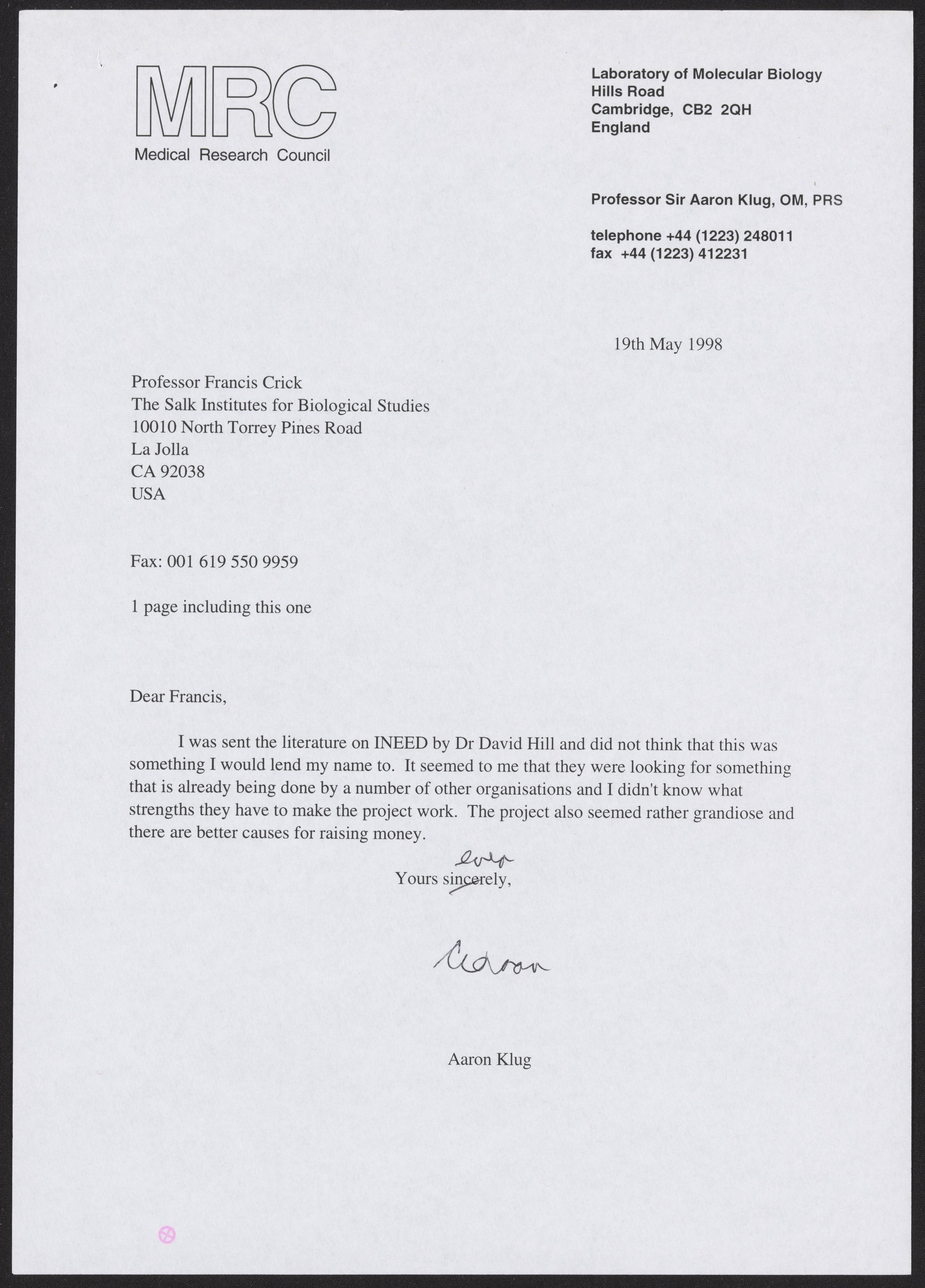 Letter from Aaron Klug to Francis Crick, May 19, 1998