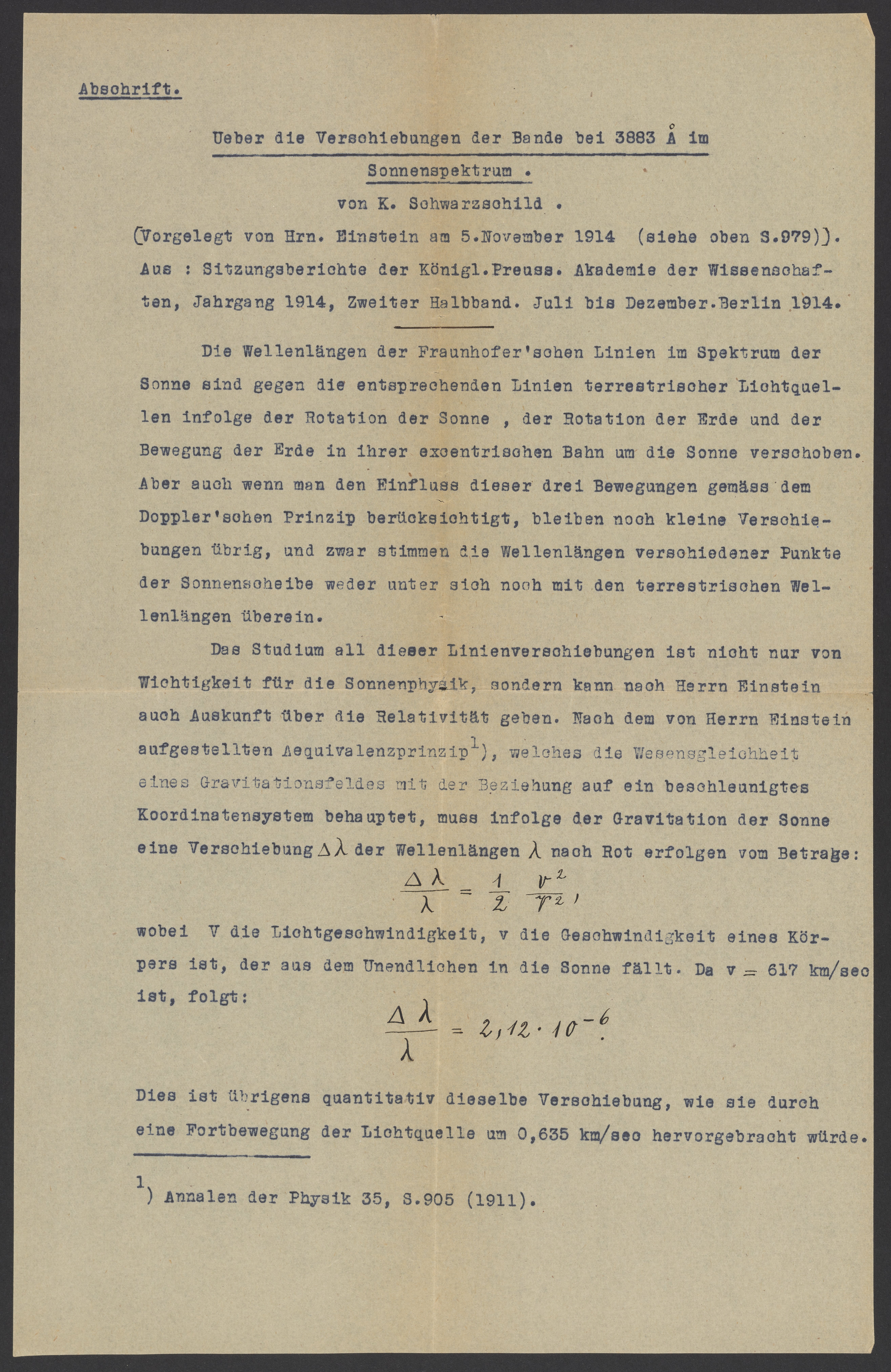 Schwarzschild, K. (Karl). “Ueber Die Verschiebungen Der Bande Bei 3883 Å Im Sonnenspektrum,” November 5, 1914. Papers of Georg and Max Bredig, Box 2, Folder 49. Science History Institute. Philadelphia. https://digital.sciencehistory.org/works/jfs70te.